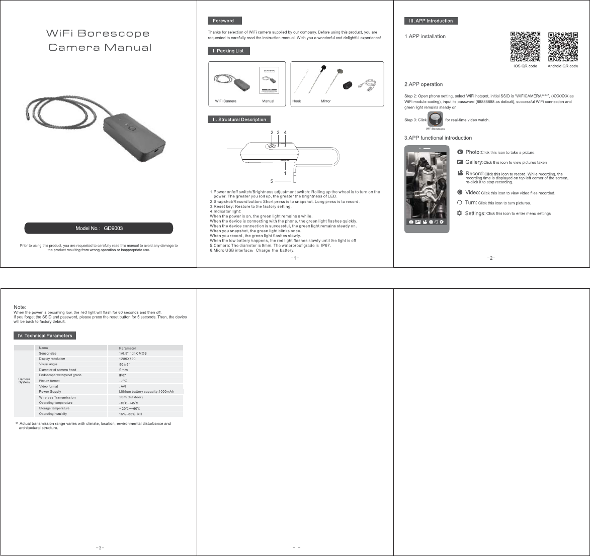 Gospell Smarthome Electronic GD9003 WiFi Borescope Camera User Manual