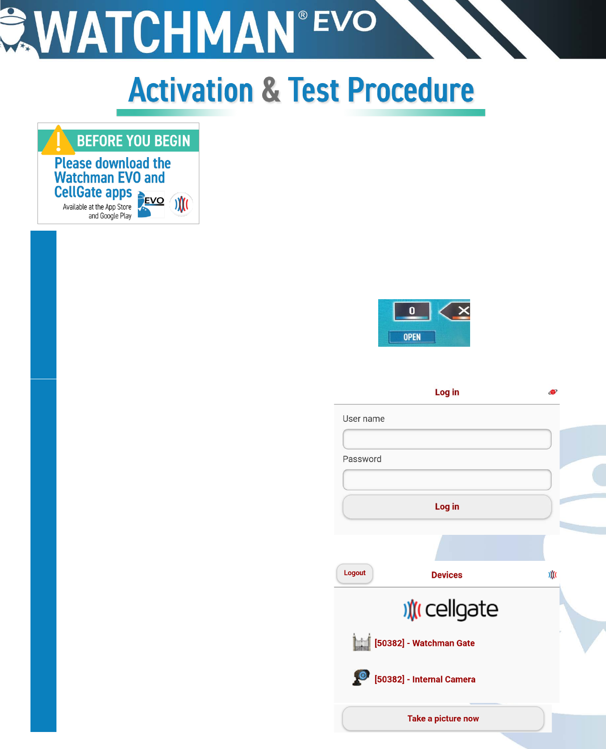 17. Press the Open button. You should hear a tone from the Watchman unit and the gate should open.