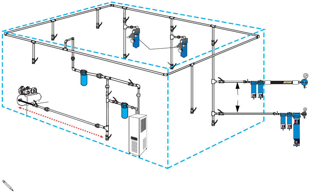 • A minimum of 25 ft. (7.62 m) from compressor to first filter outlet is required to cool air [50 ft. (15.24 m) optimum]