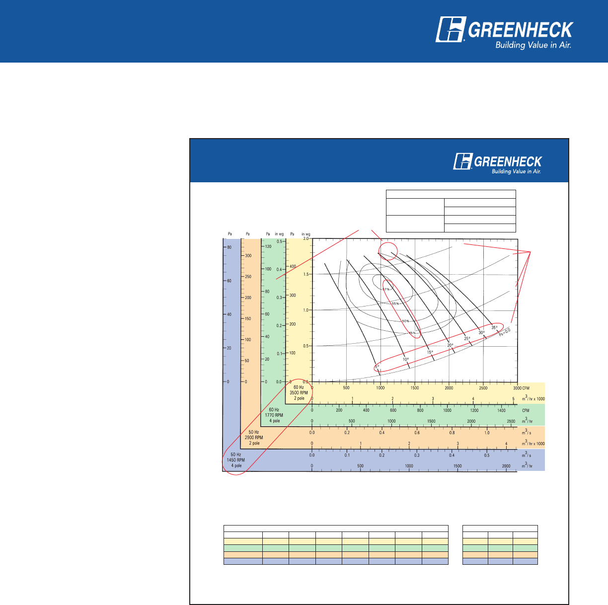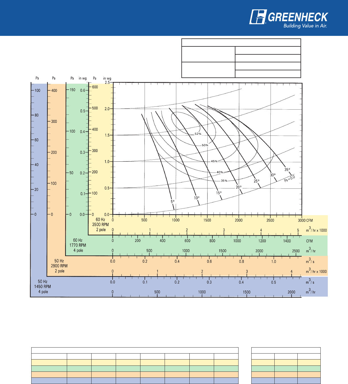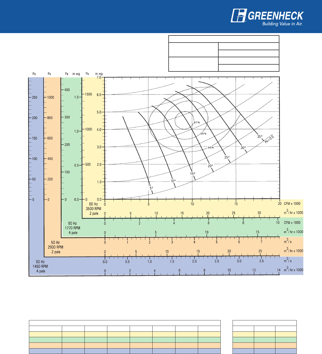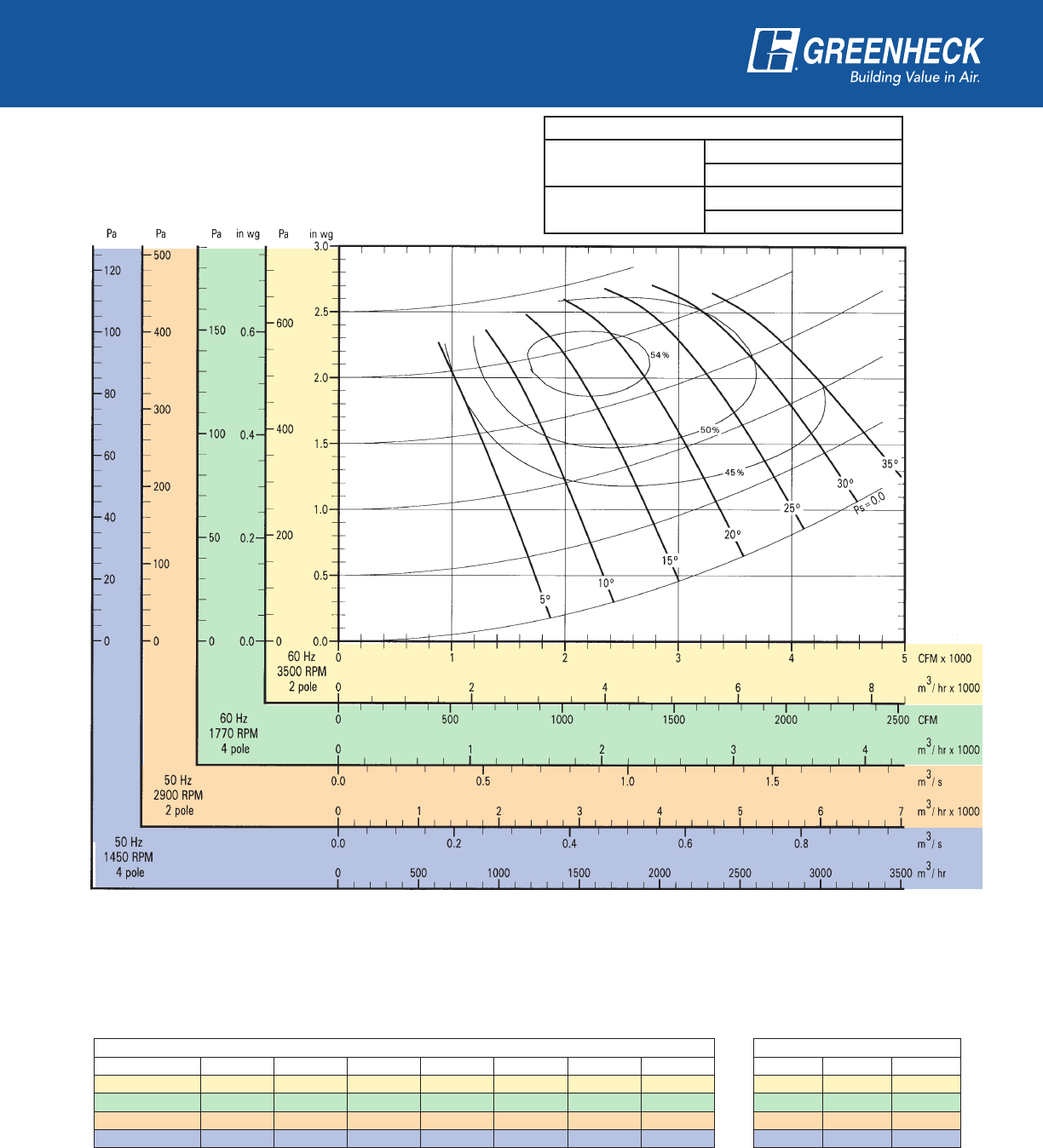 power frequency and motor speed for easy and quick reference in finding air performance, power requirements,