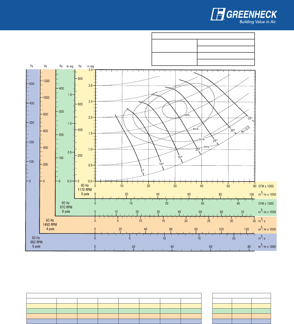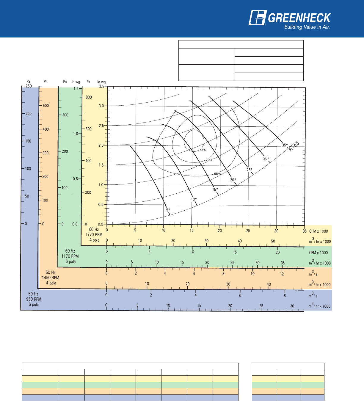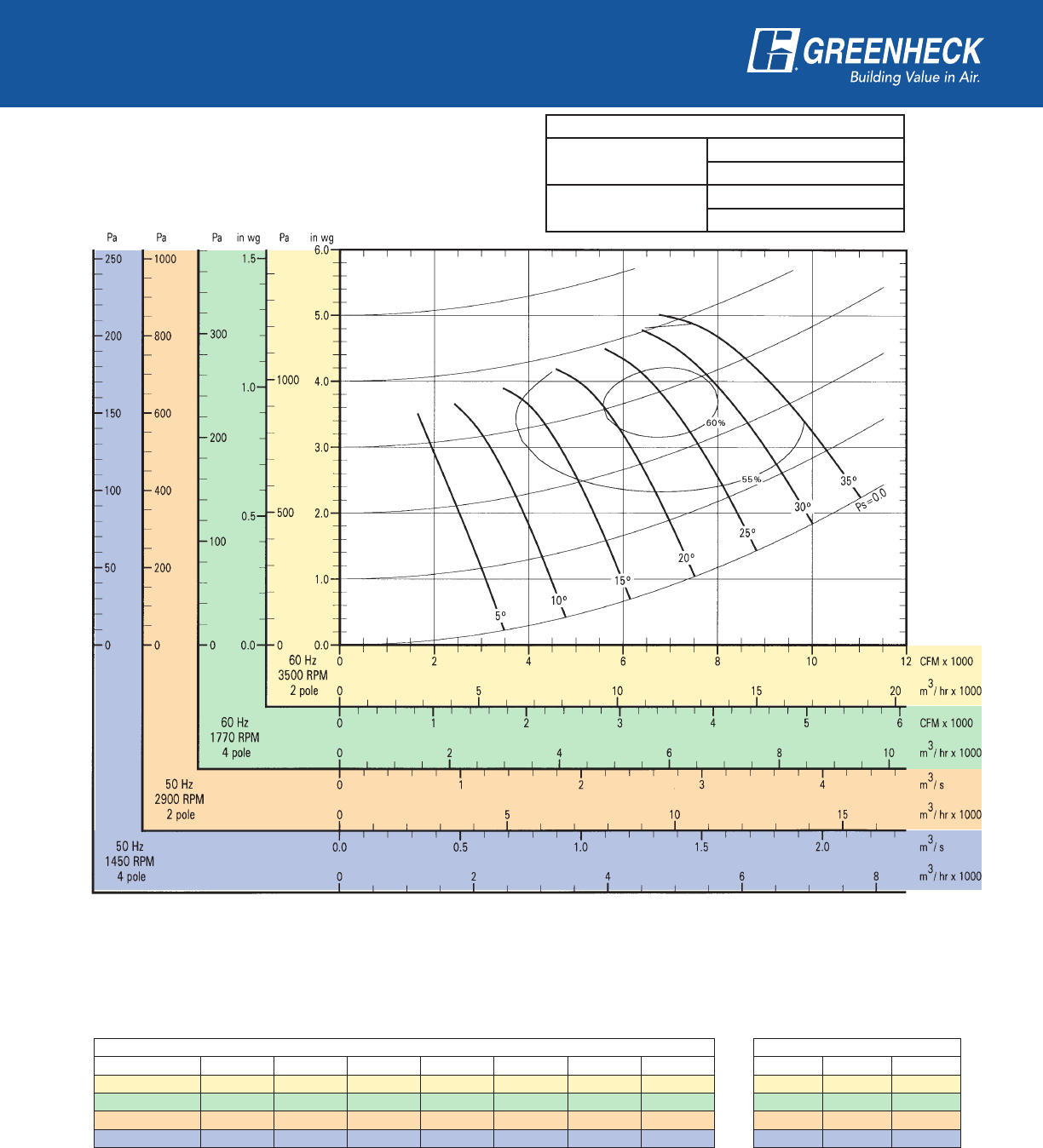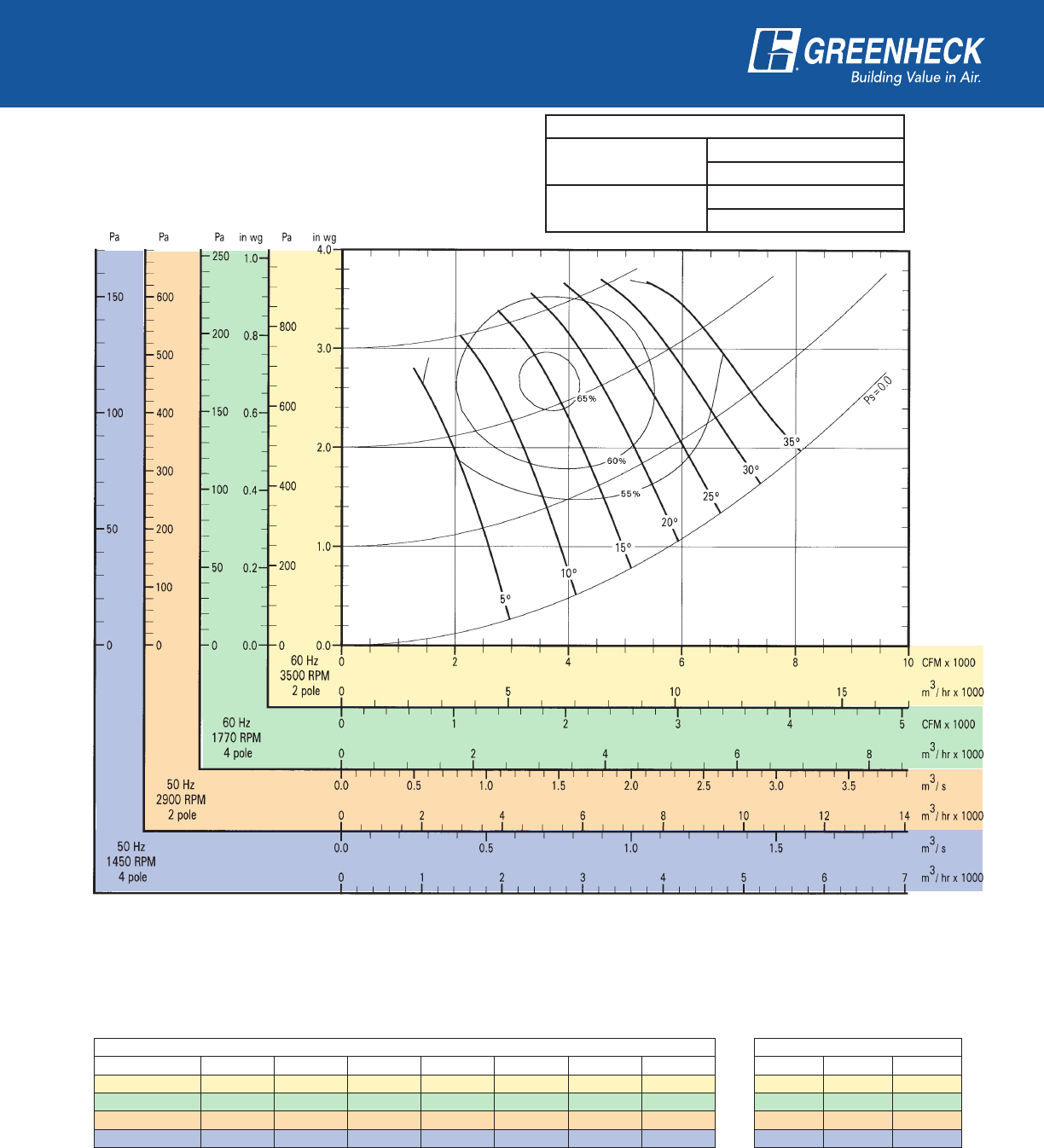 power frequency and motor speed for easy and quick reference in finding air performance, power requirements,