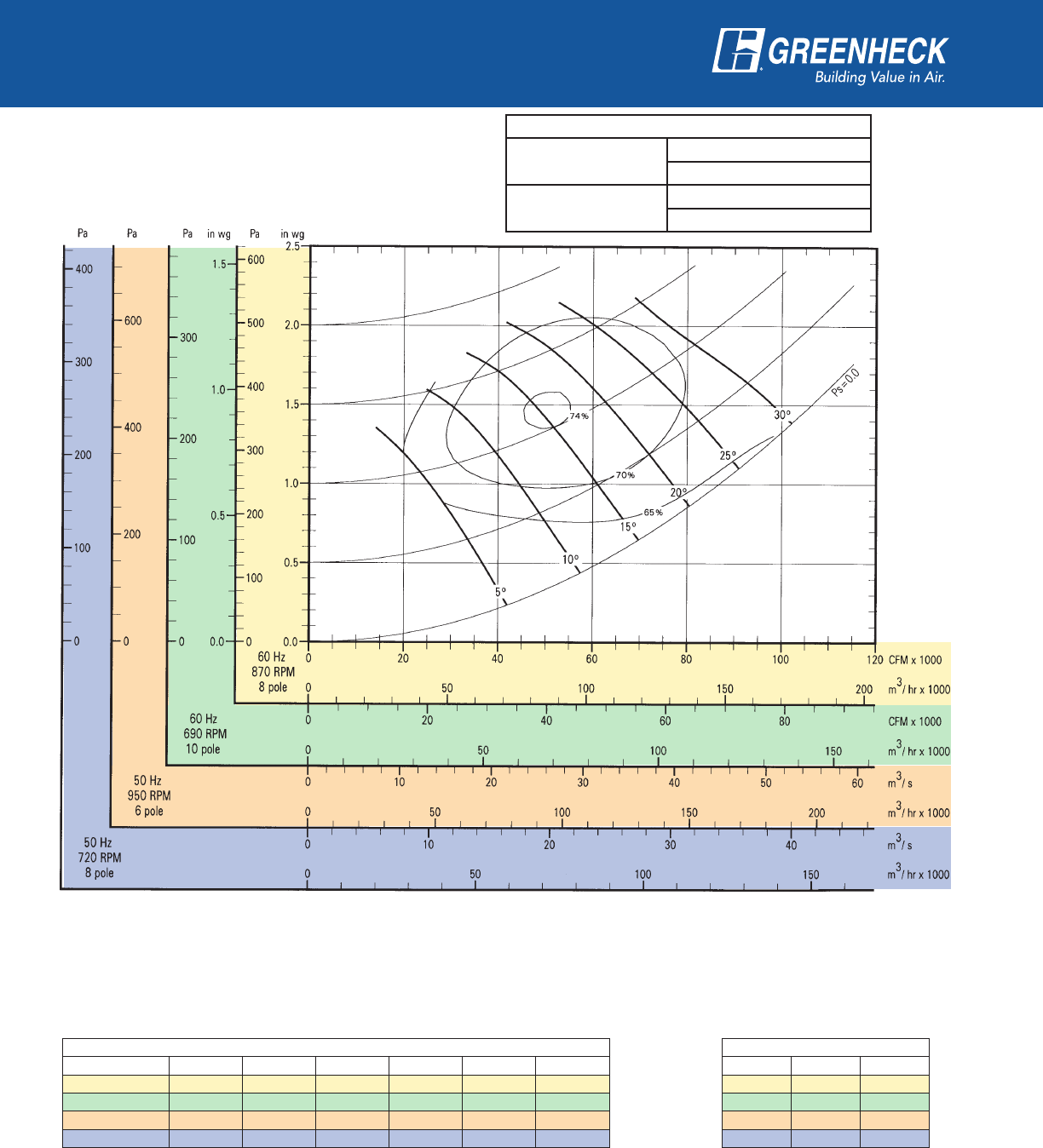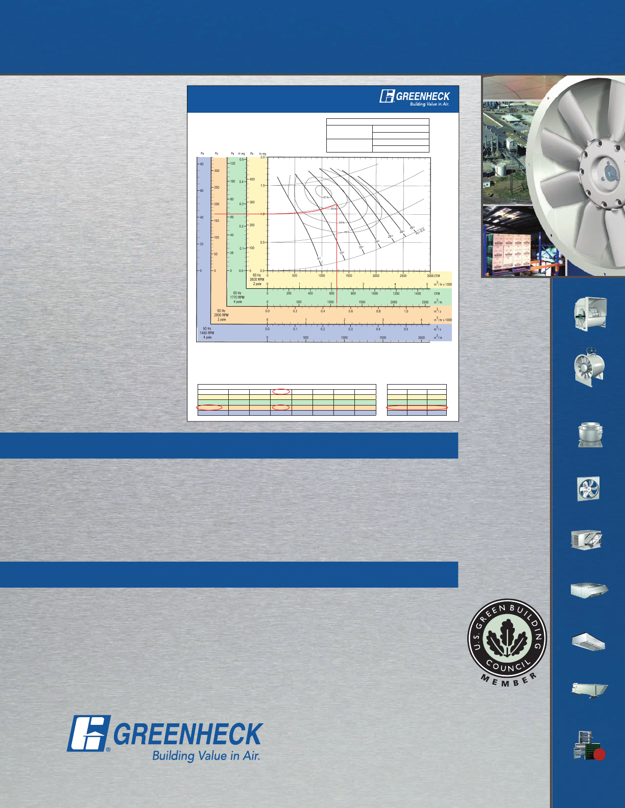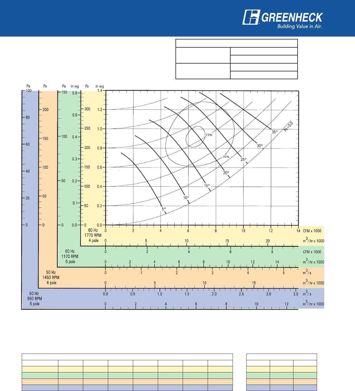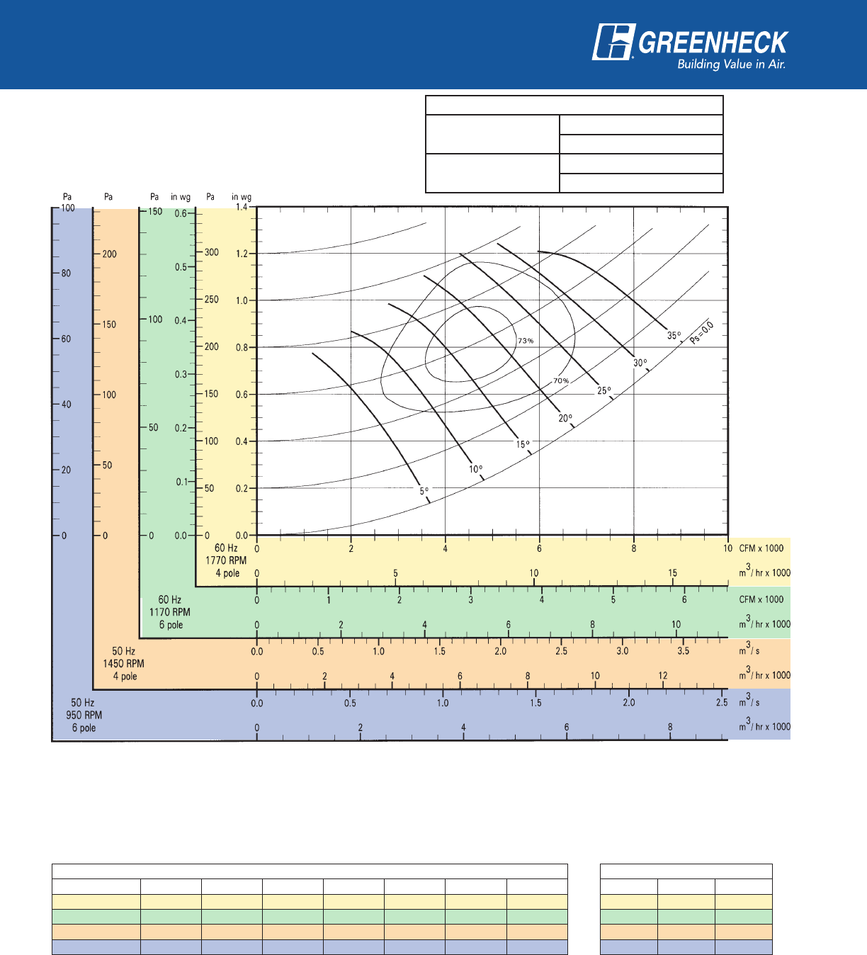 power frequency and motor speed for easy and quick reference in finding air performance, power requirements,