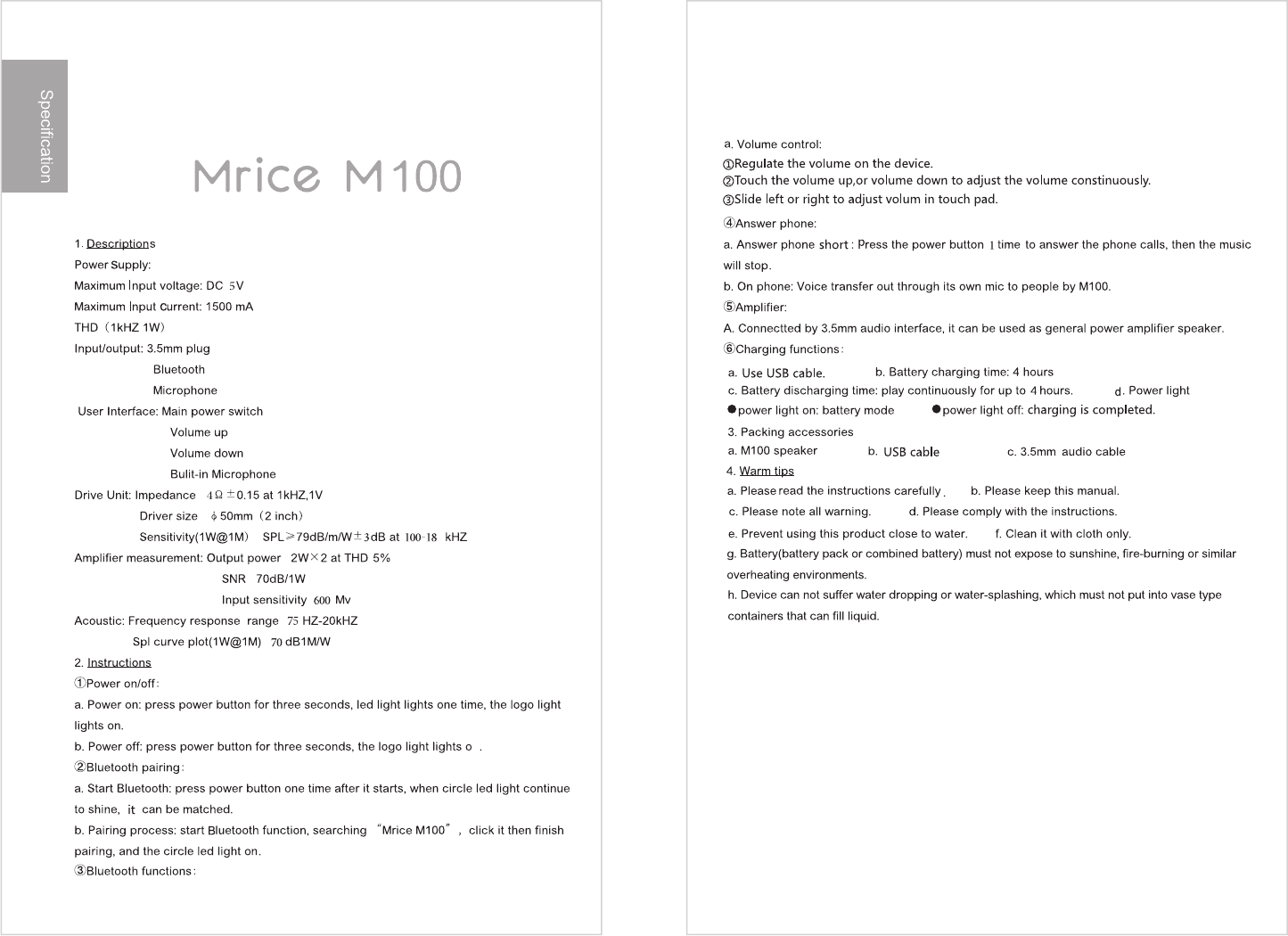 Guangzhou Mrice Digital Technology MLLM100 Bluetooth Speaker User Manual M100 3C