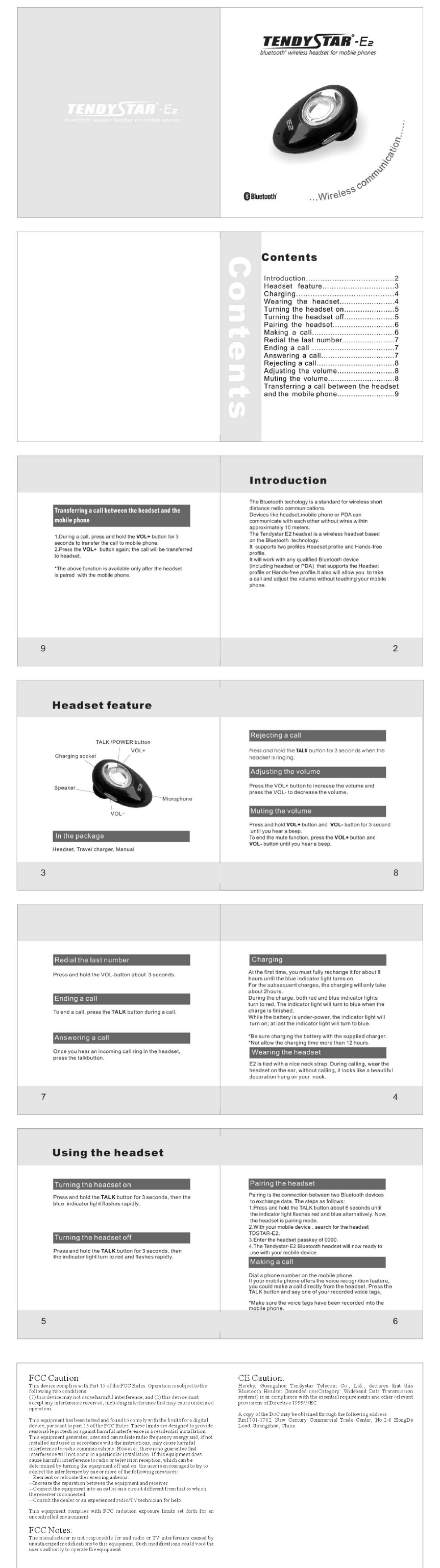 Guangzhou Tendystar Telecom E2 BLUETOOTH HEADSET User Manual users manual