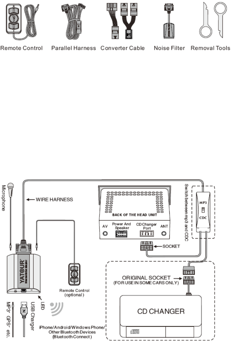 2. On some car models YT-BTA is with MP3/CDC switch cable, when needing to use original CD