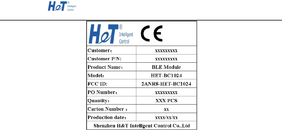 de of the finished product which states: “Contains transmitter module FCC ID: 2ANR8-HET-BC10