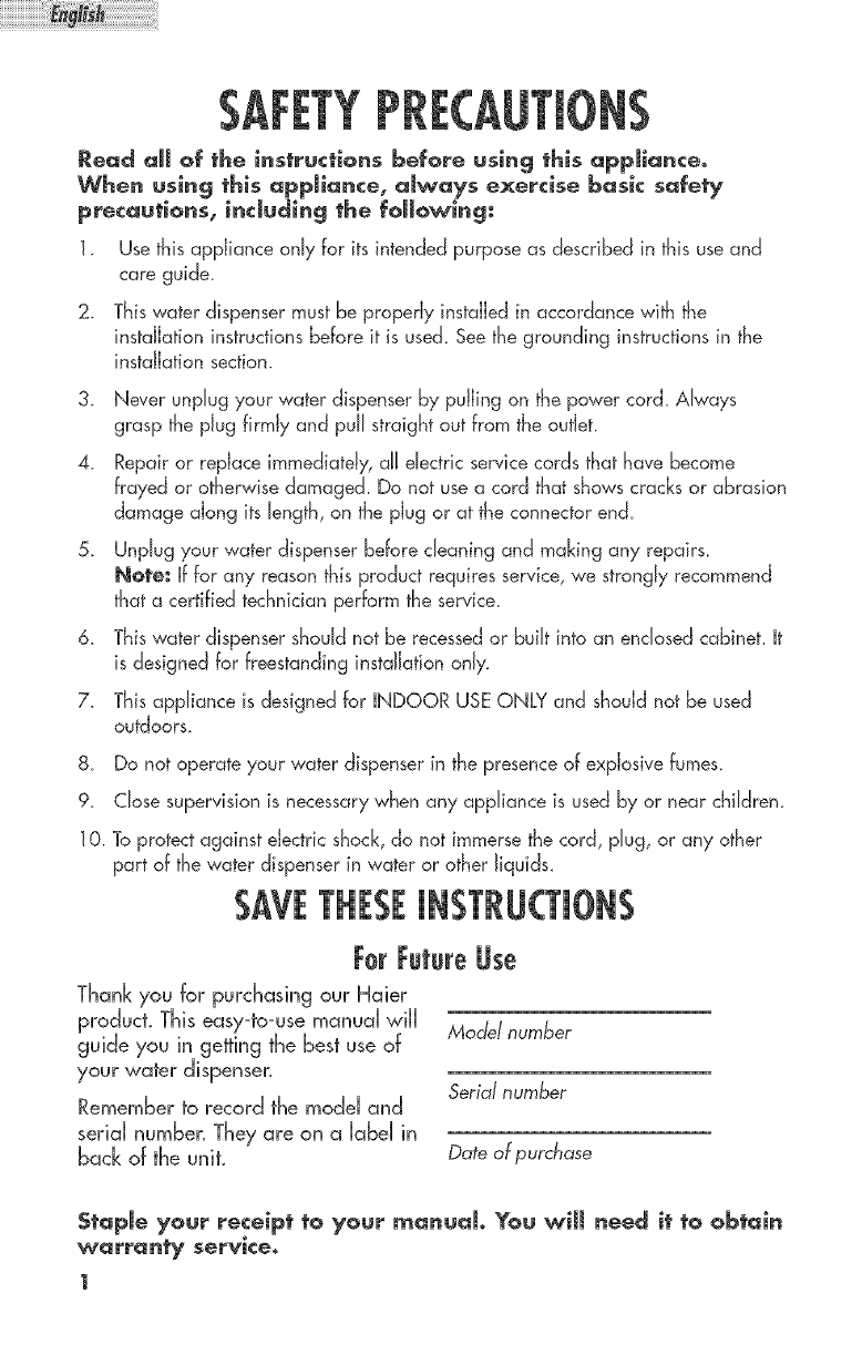 Staple your receipt to your manual° You wiJJ need it to obtain