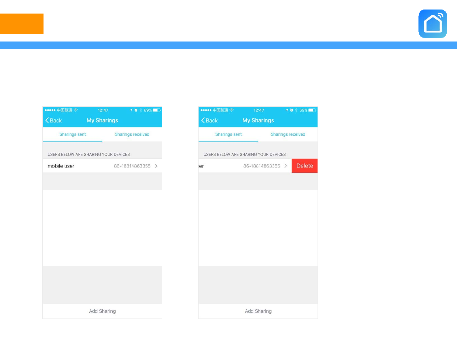 You can delete the member and cancel the sharing by sliding to left. 发送Sharings: