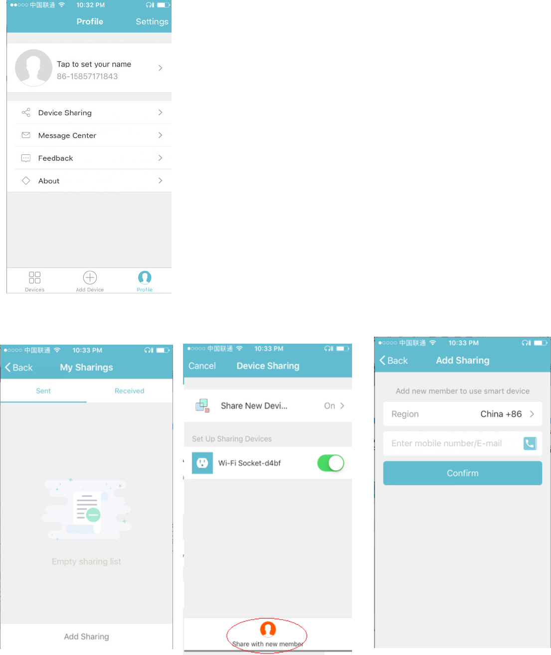Add sharing: As shown in the picture, users could type in a new member’s cellphone number