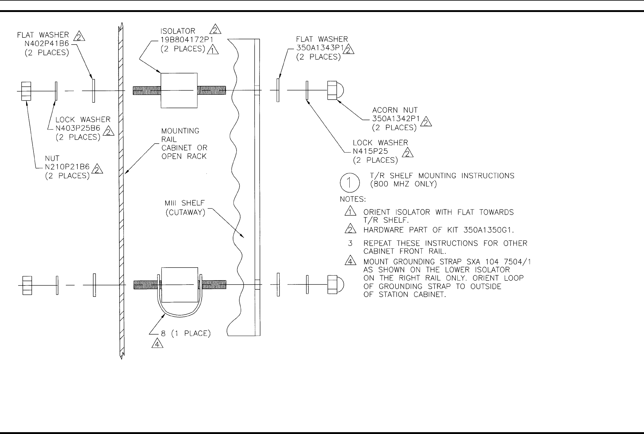 The MASTR III 800 MHz T/R shelf is mounted in the station cabinet using Isolator Kit 350A1350G1, which provides