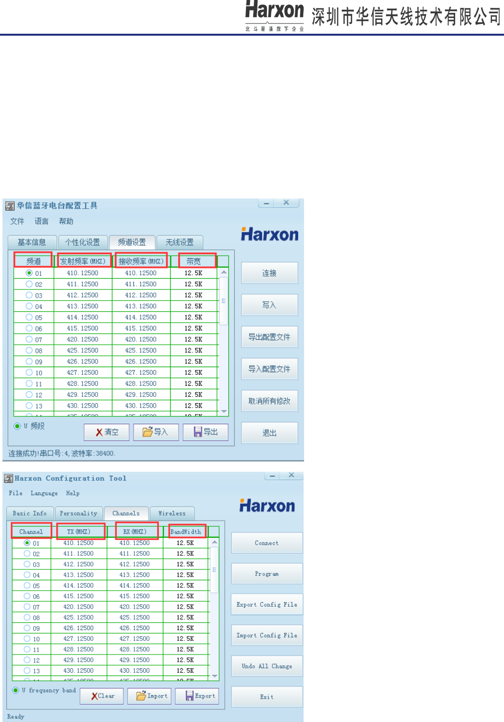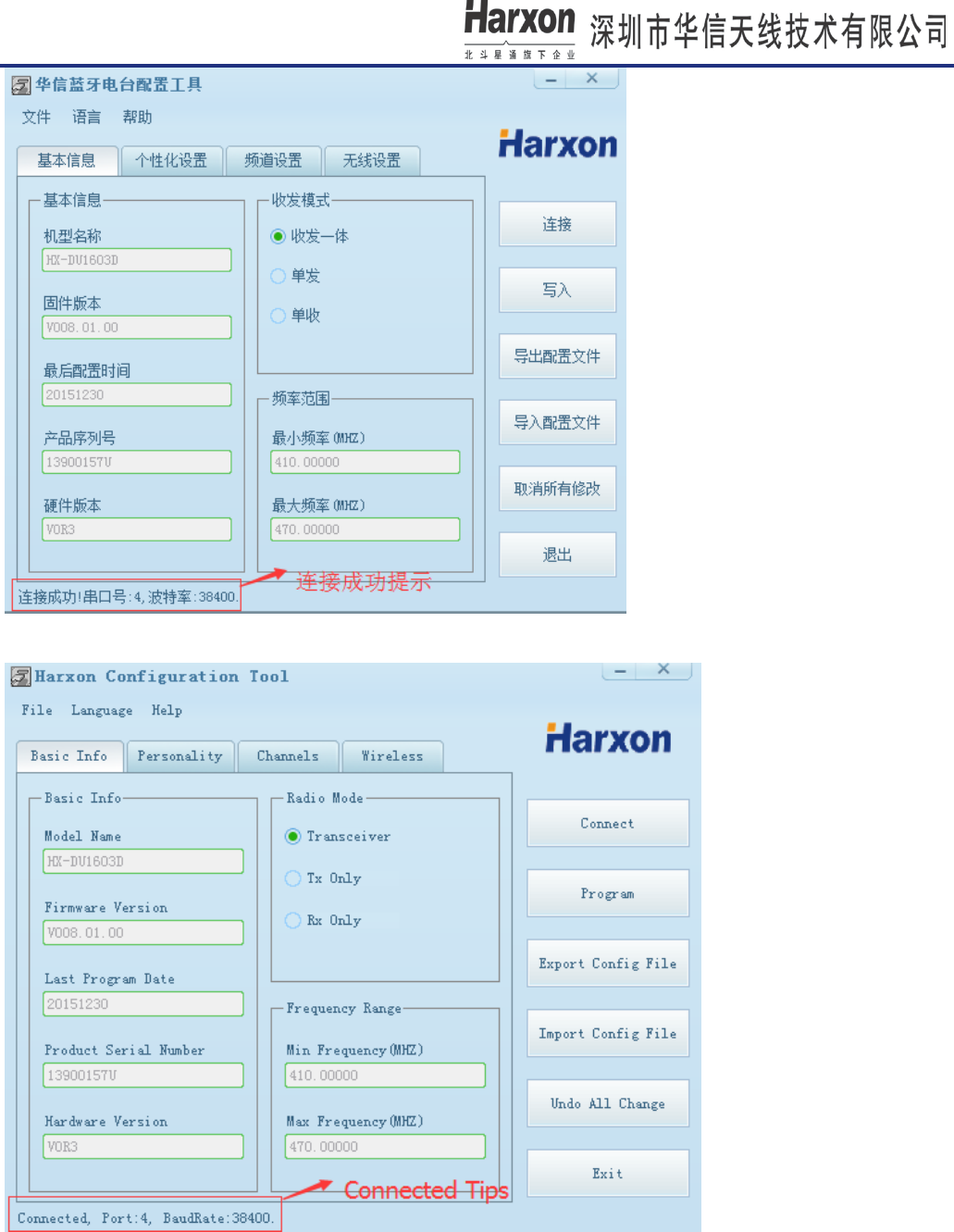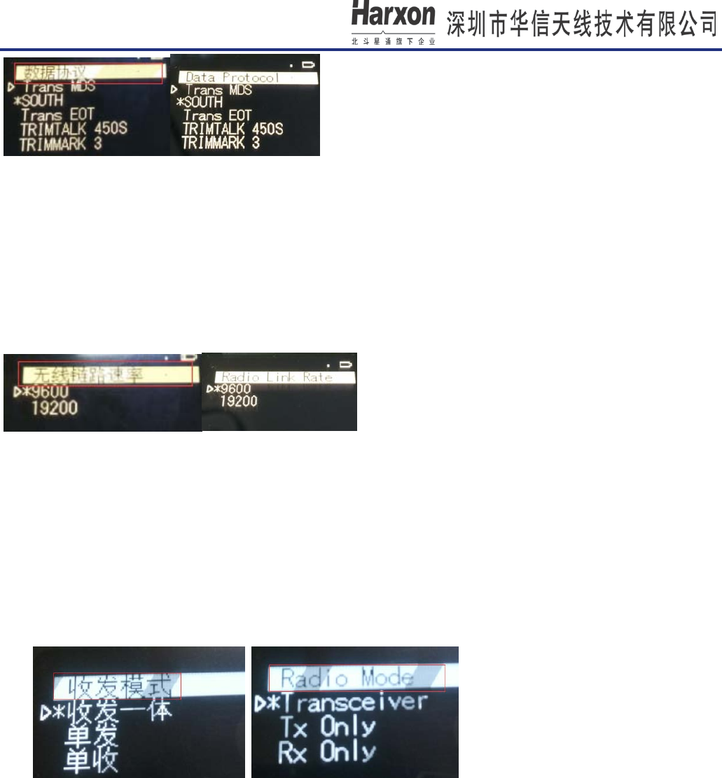 parameter, current TX/RX, Data protocol, Link rate, Radio mode. For example: TX=RX=410.125MHZ,Data