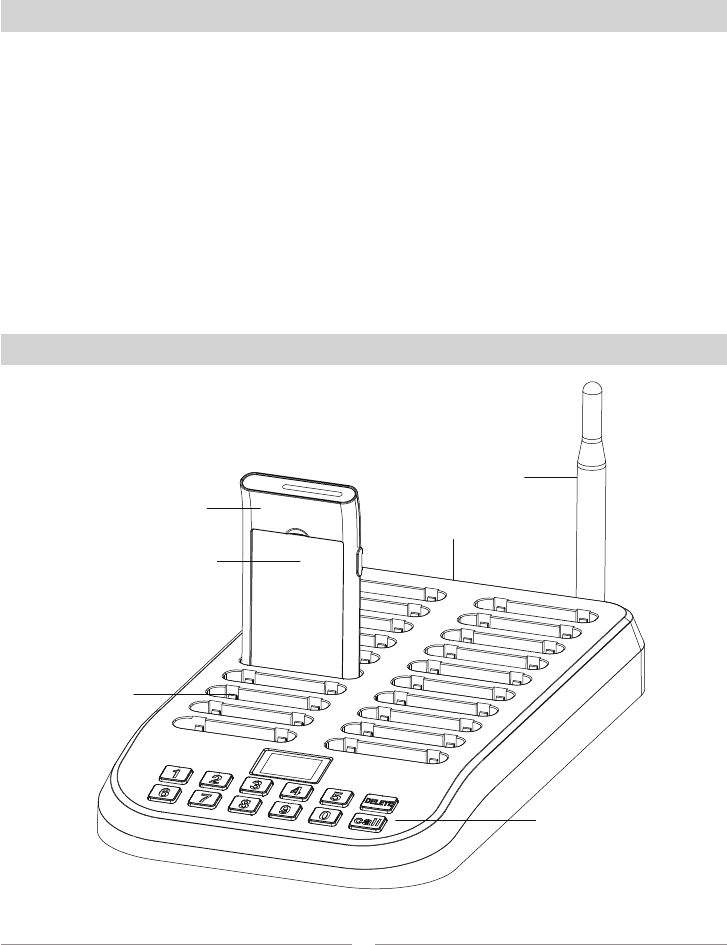 receiving pager supports 999-channel extensions, the call button keypad has 20 battery charging slots.