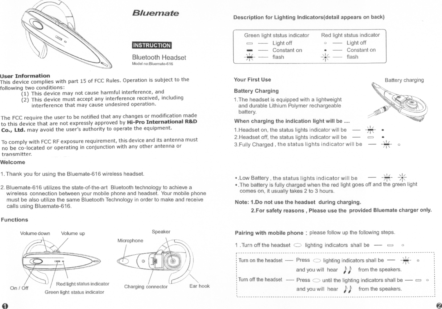 HI Pro R and D BLUEMATE-616 Bluetooth Headset User Manual Users manual