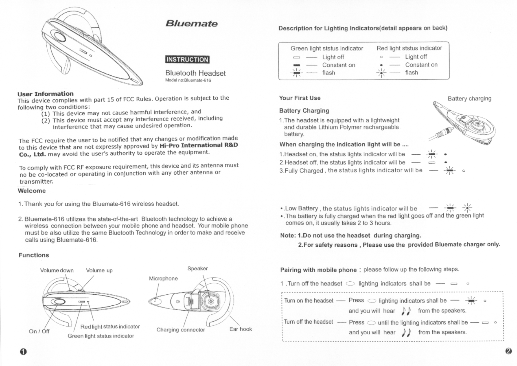 HI Pro R and D BLUEMATE-616 Bluetooth Headset User Manual Users manual