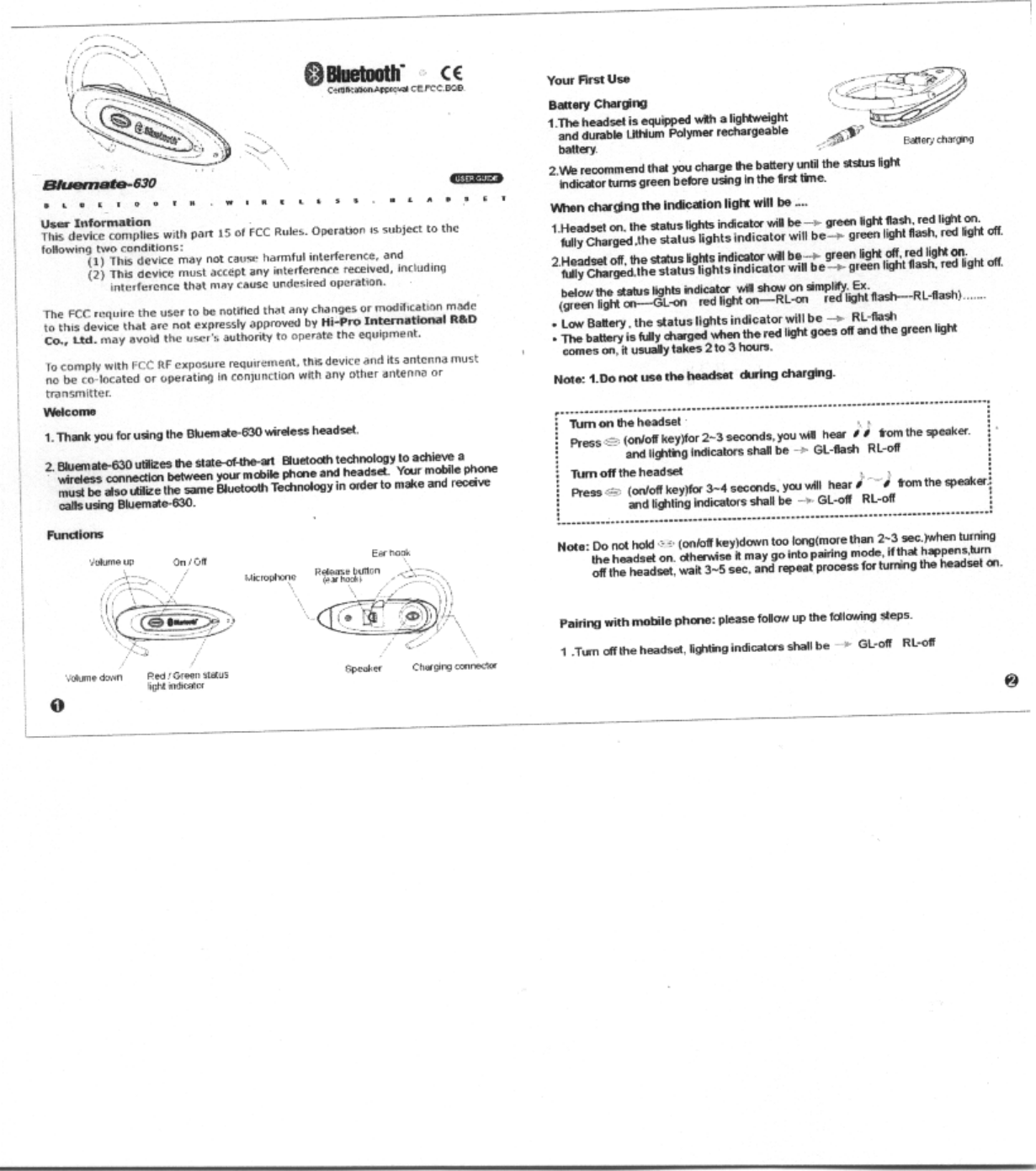 HI Pro R and D BLUEMATE-630 Bluetooth Headset User Manual