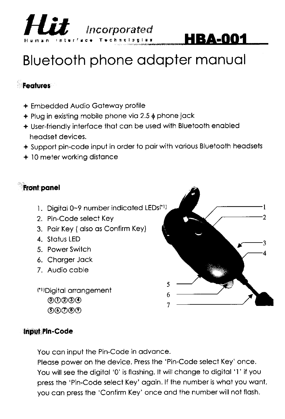 HIT orporated HITBTPAHBA001 Bluetooth Phone Adapter User Manual