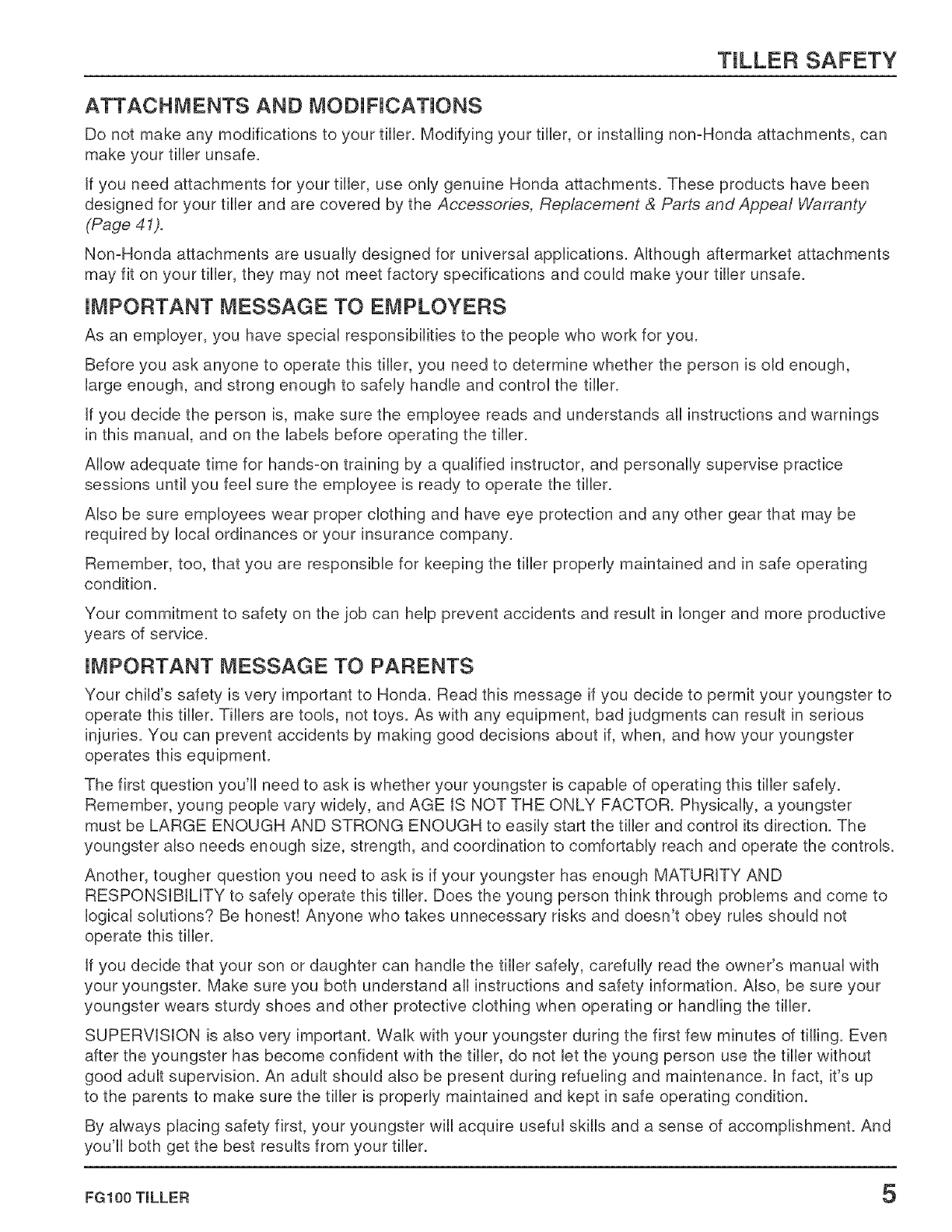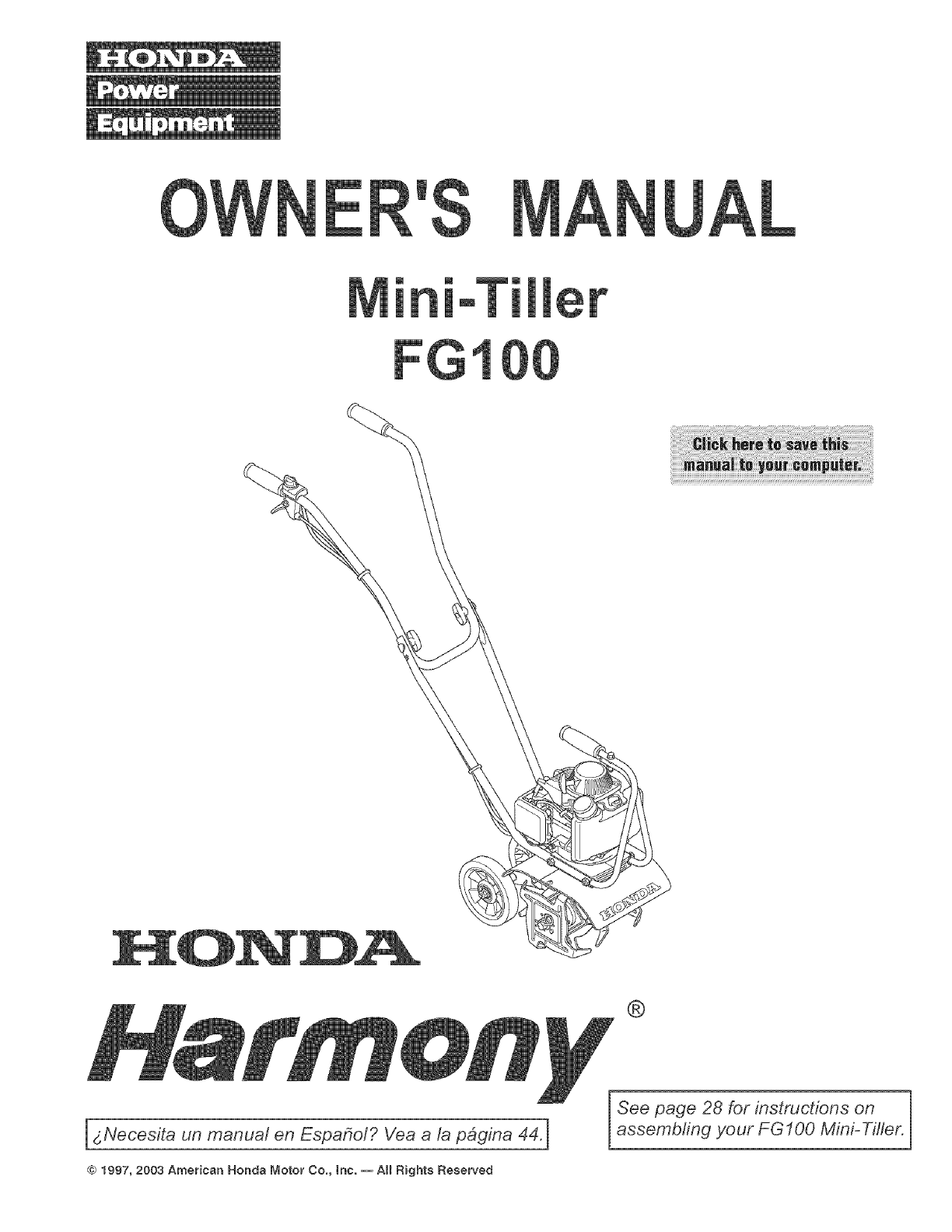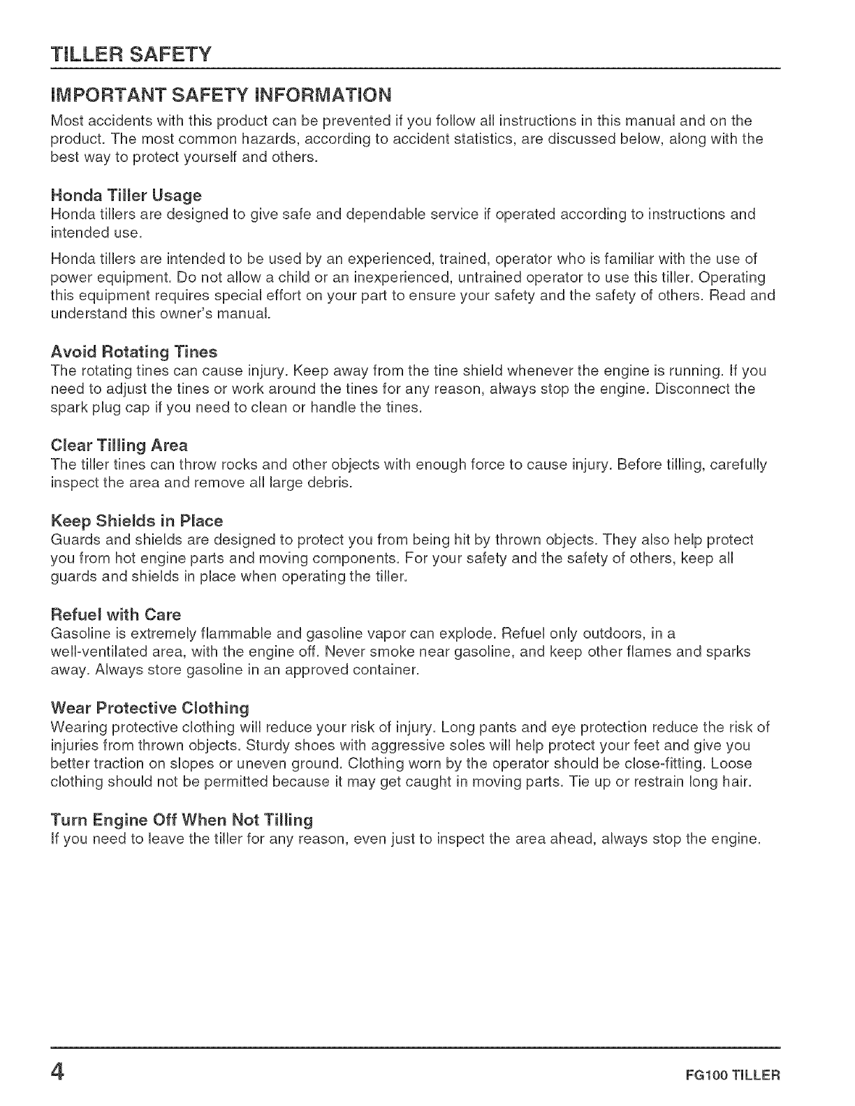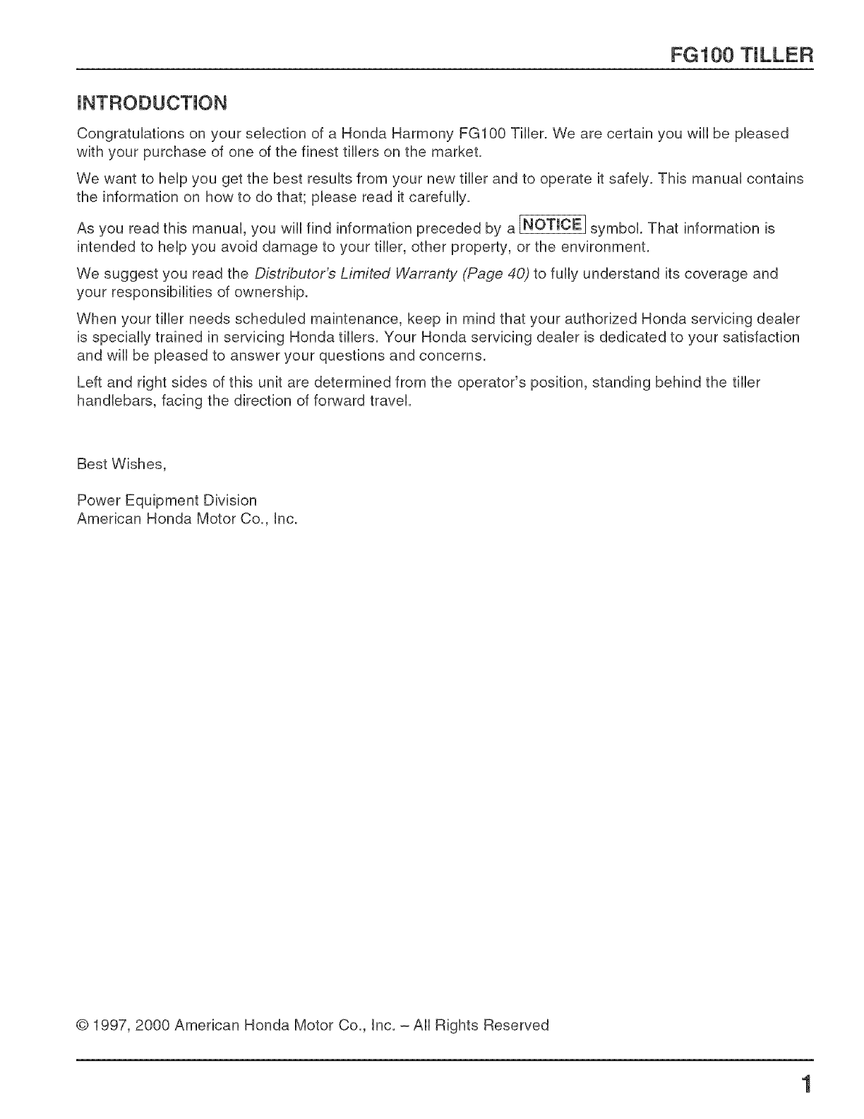 Congratulations on your selection of a Honda Harmony FG100 Tiller. We are certain you will be pleased
