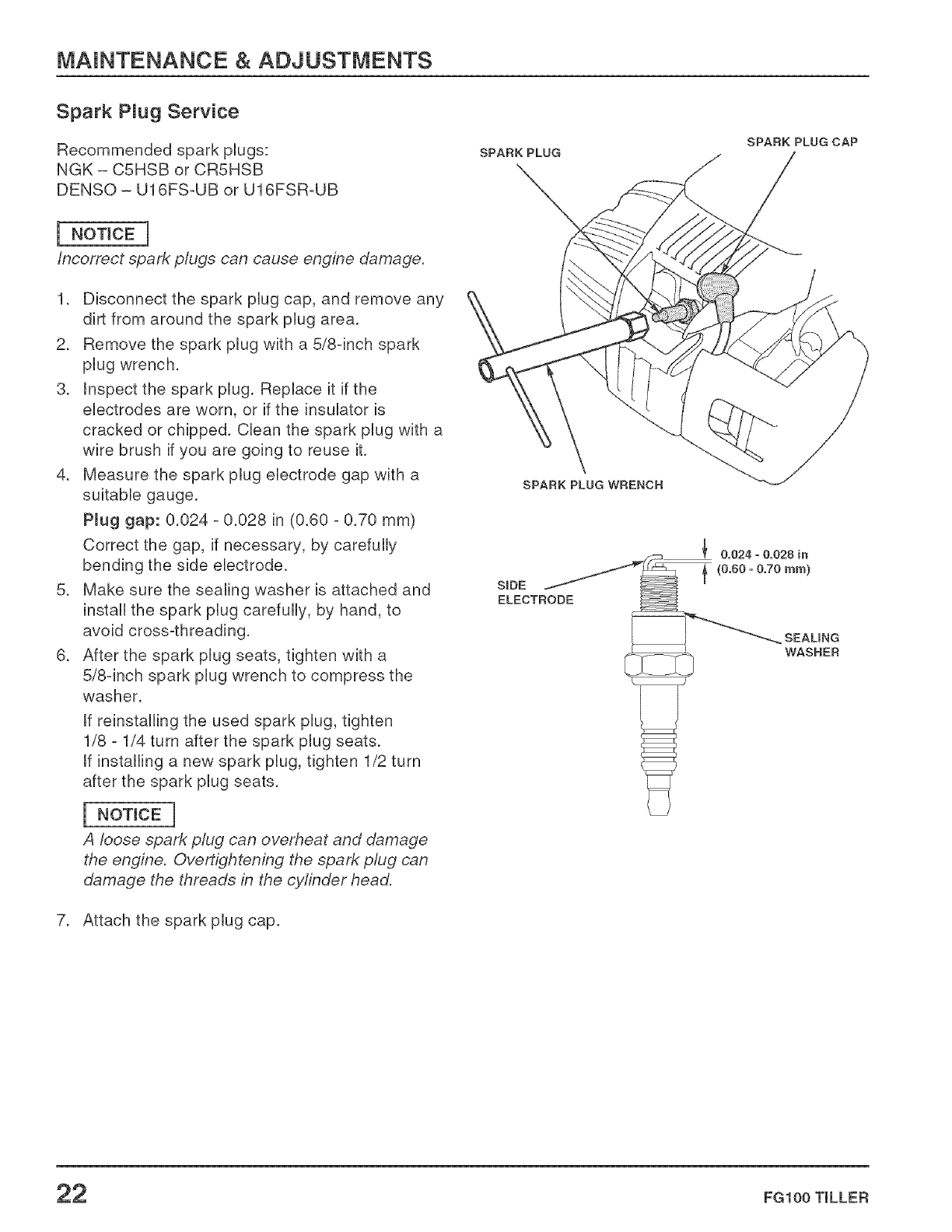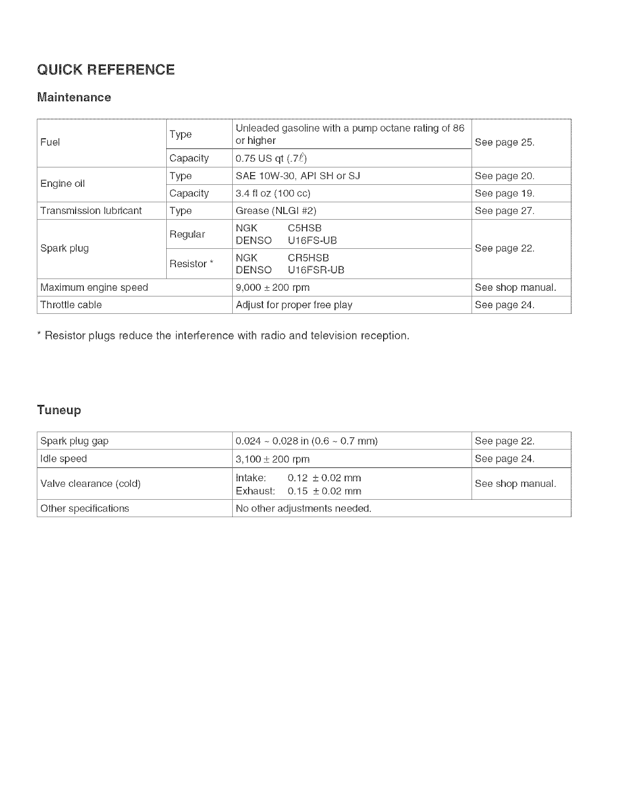 Spark plug gap 0.024 _ 0.028 in (0.6 _-0.7 mm) See page 22.