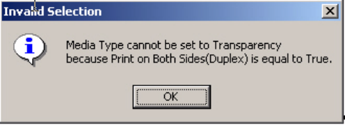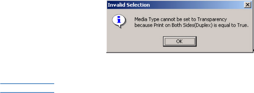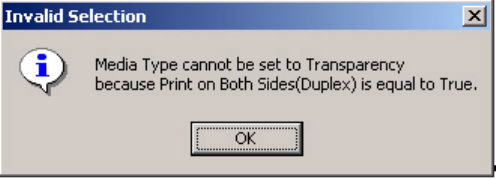 Figure 5. Invalid Selection - duplexing for transparencies ...........................................................................20