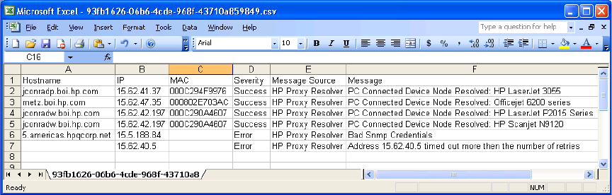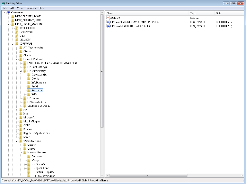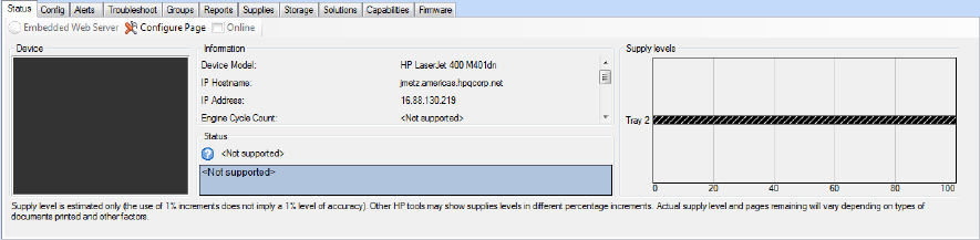 The following is an example of an HP LaserJet M401 device that was discovered via HP SNMP Proxy