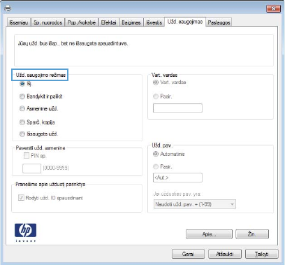 - Konfigūruokite HP dažų kasetės apsaugos eksploatacinių medžiagų nustatymus
