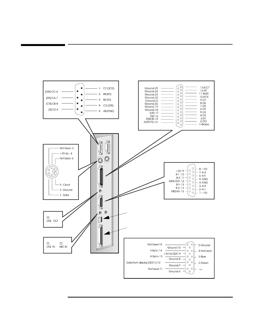 •MIDI-grensesnittkontakt (en kanal), mikrofon inn-kontakt, linje inn-