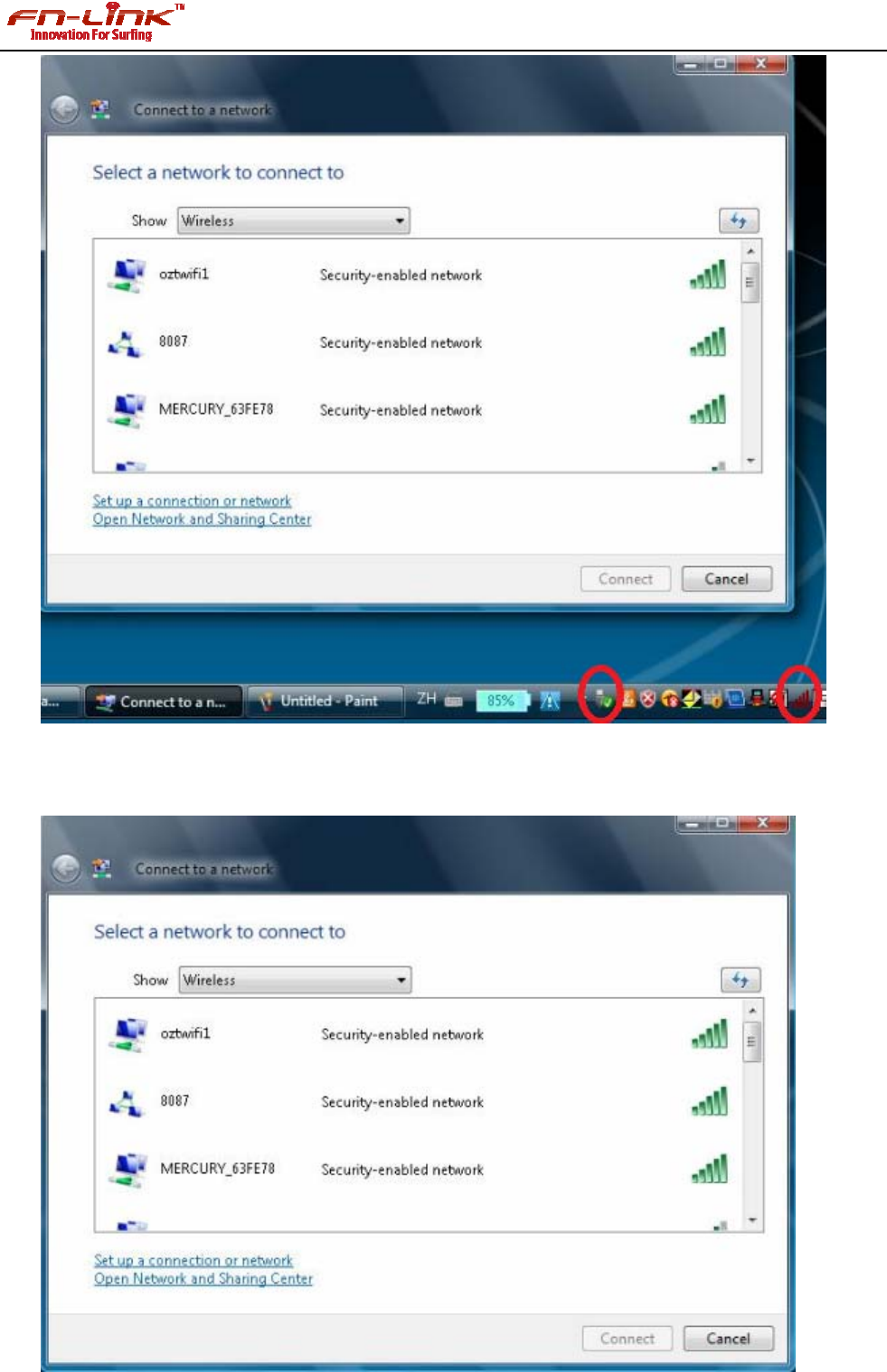 The USB icon and wireless network adapter displaying in the lower right of the screen.