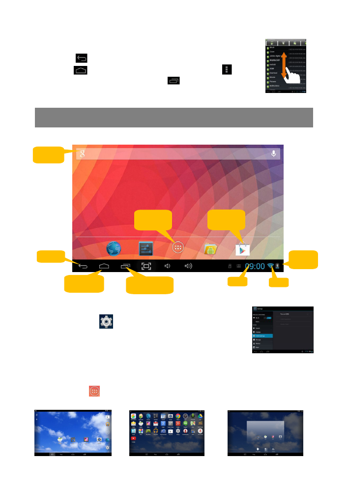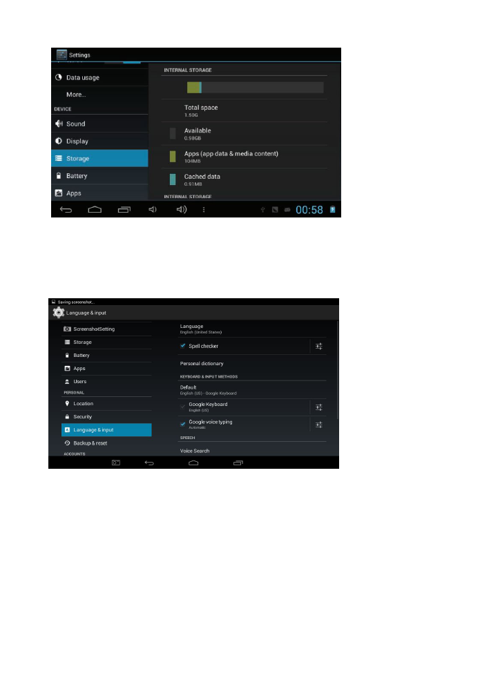 device, e.g. Language, Display, WiFi, Sound, Apps etc..