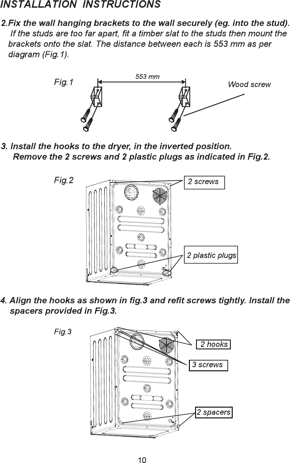 5. With assistance, mount dryer on wall brackets. See Fig.4.