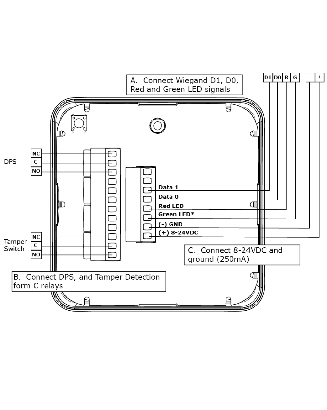 NOTE 1: The Green LED and Red LED inputs control feedback that displays at the reader for