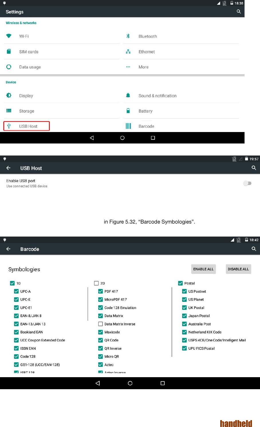 A test application "Barcode Decoder" for the barcode scanner is also installed on the device. This directly