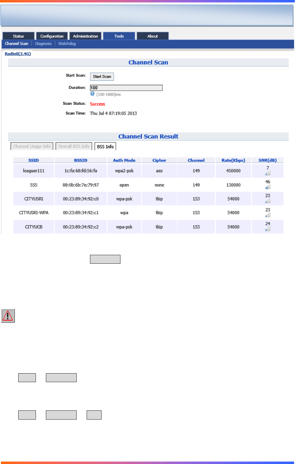Scan Status:AP-100 Base station channel scan status,“Ready” means it can start scan. “Success”
