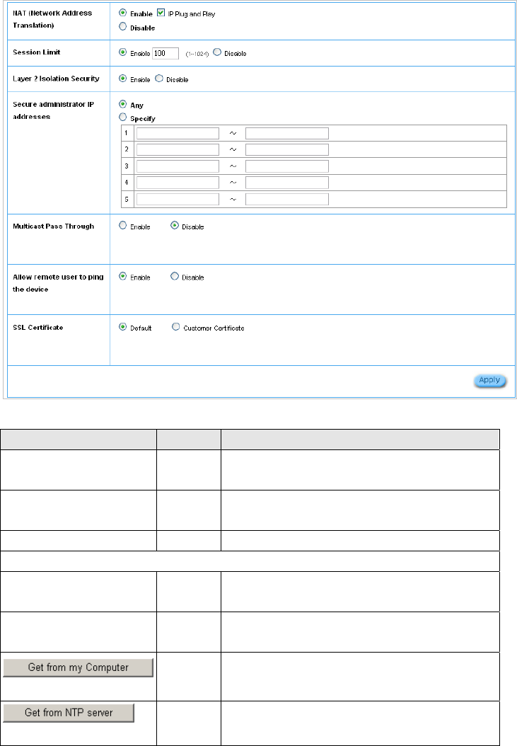 Administration Access Control, Layer 2 Isolation, SSL Login page, VPN (IPSec/PPTP/L2TP), PPTP