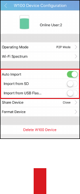 • P2P Mode: Wi-Fi Direct feature is on. W100 WLAN name is DIRECT-XXX.