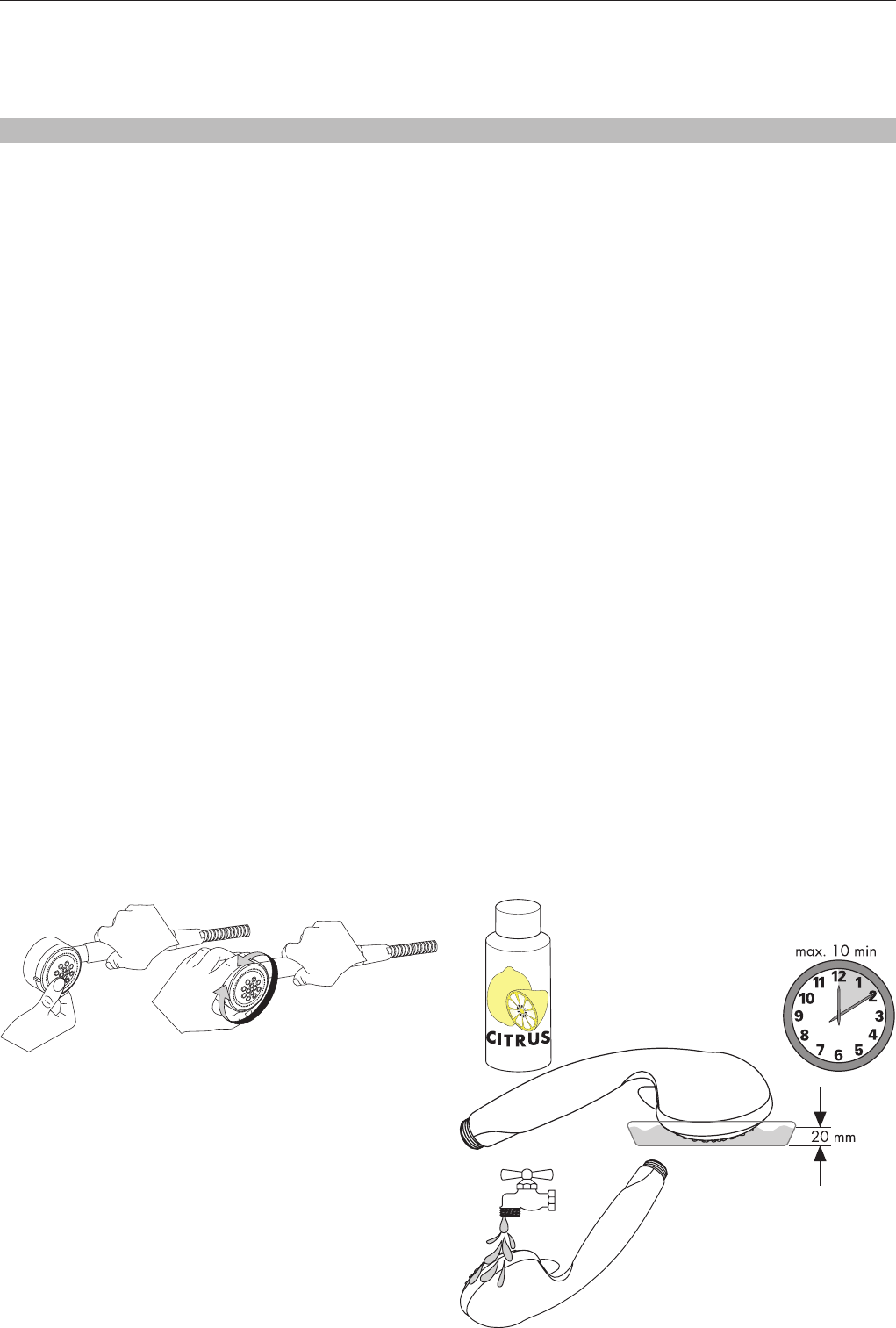 • Only use cleaning material which is explicitly provided for this type of application, such as Hansgrohe’s Decalcifying Agent (A), which