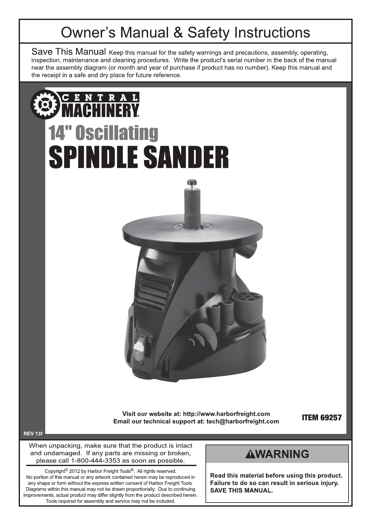 Harbor Freight 14 In Oscillating Spindle Sander Product Manual