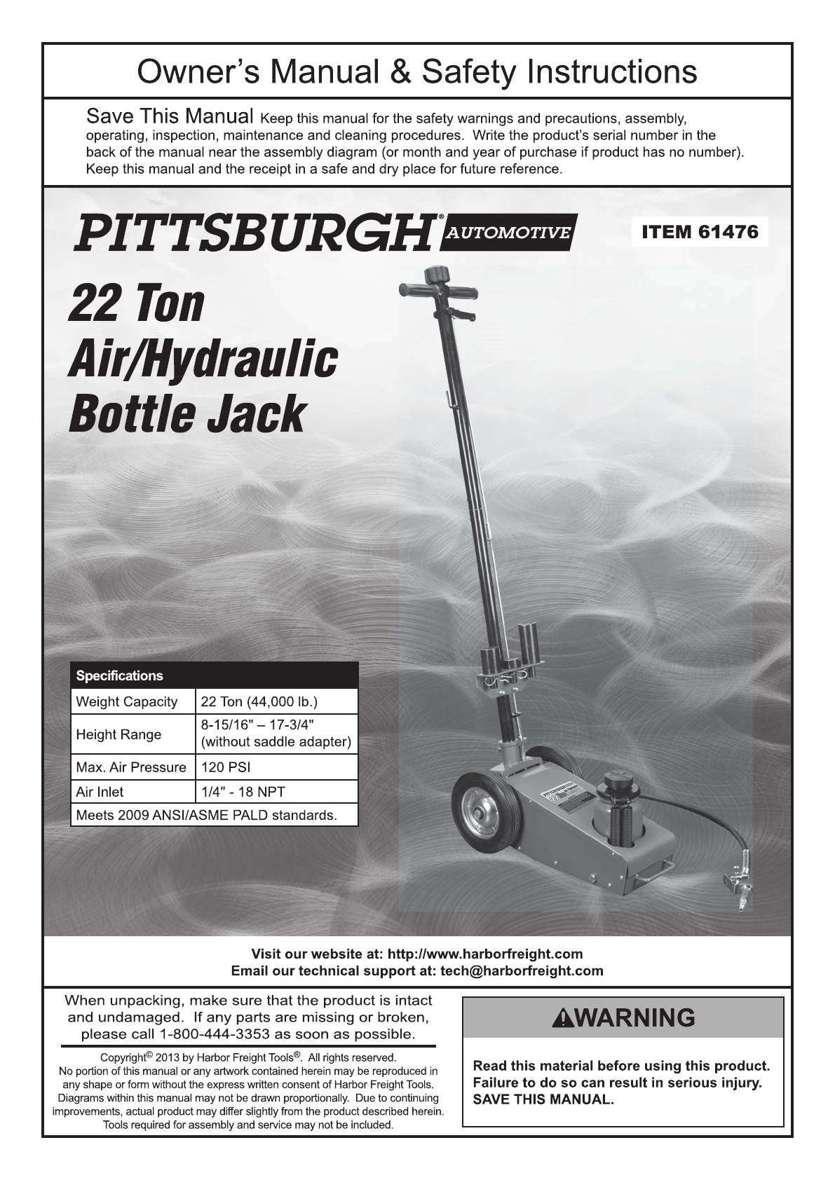 Harbor Freight 22 Ton Air Hydraulic Floor Jack Product Manual