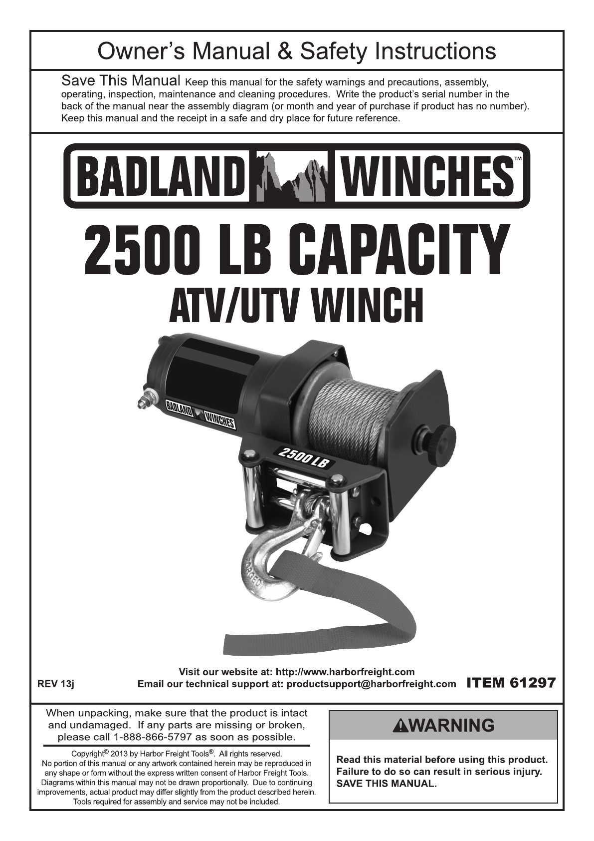 Manual for the 61297 2500 lb. ATV/Utility Electric Winch with Wireless Remote Control 61297 2500 lb. ATV/Utility Electric Winch with Wireless Remote Control