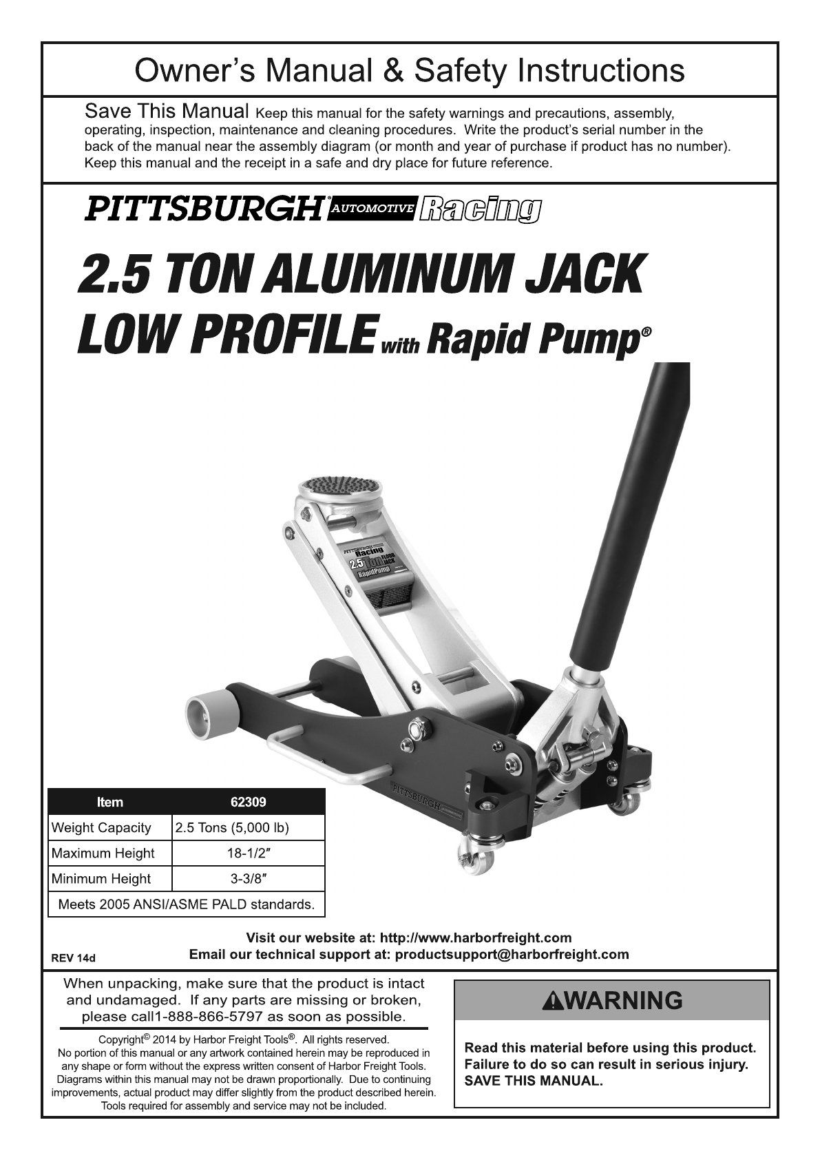 Harbor Freight 2 5 Ton Aluminum Racing Floor Jack With Rapidpump Product Manual