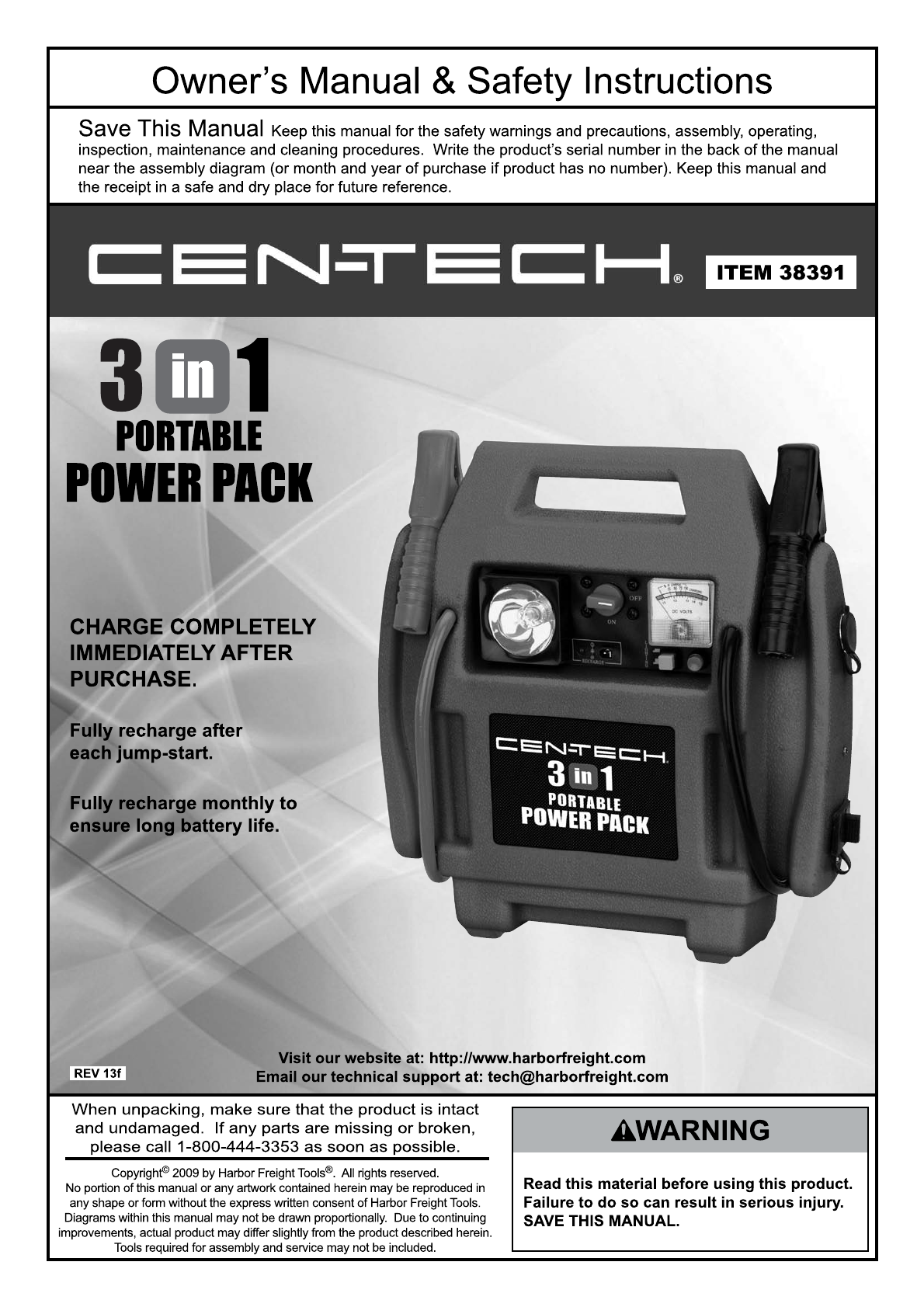 Harbor Freight 3 In 1 Jump Starter And Power Supply Product Manual