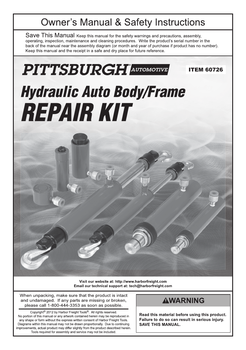 Manual for the 60726 7 Piece Hydraulic Auto Body/Frame Repair Kit 60726 7 Pc Hydraulic Auto Body/Frame Repair Kit