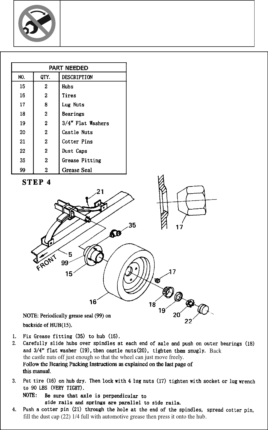 • Repack bearings after every 3,000 miles of use.