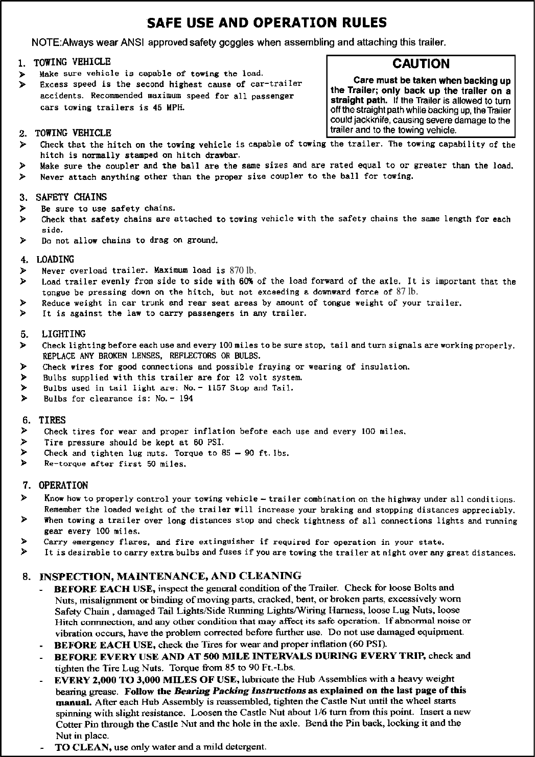 10. Trailer load should not exceed 870 lb. capacity and must be properly secured.