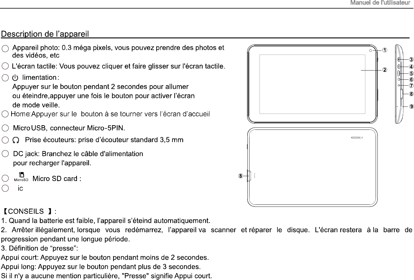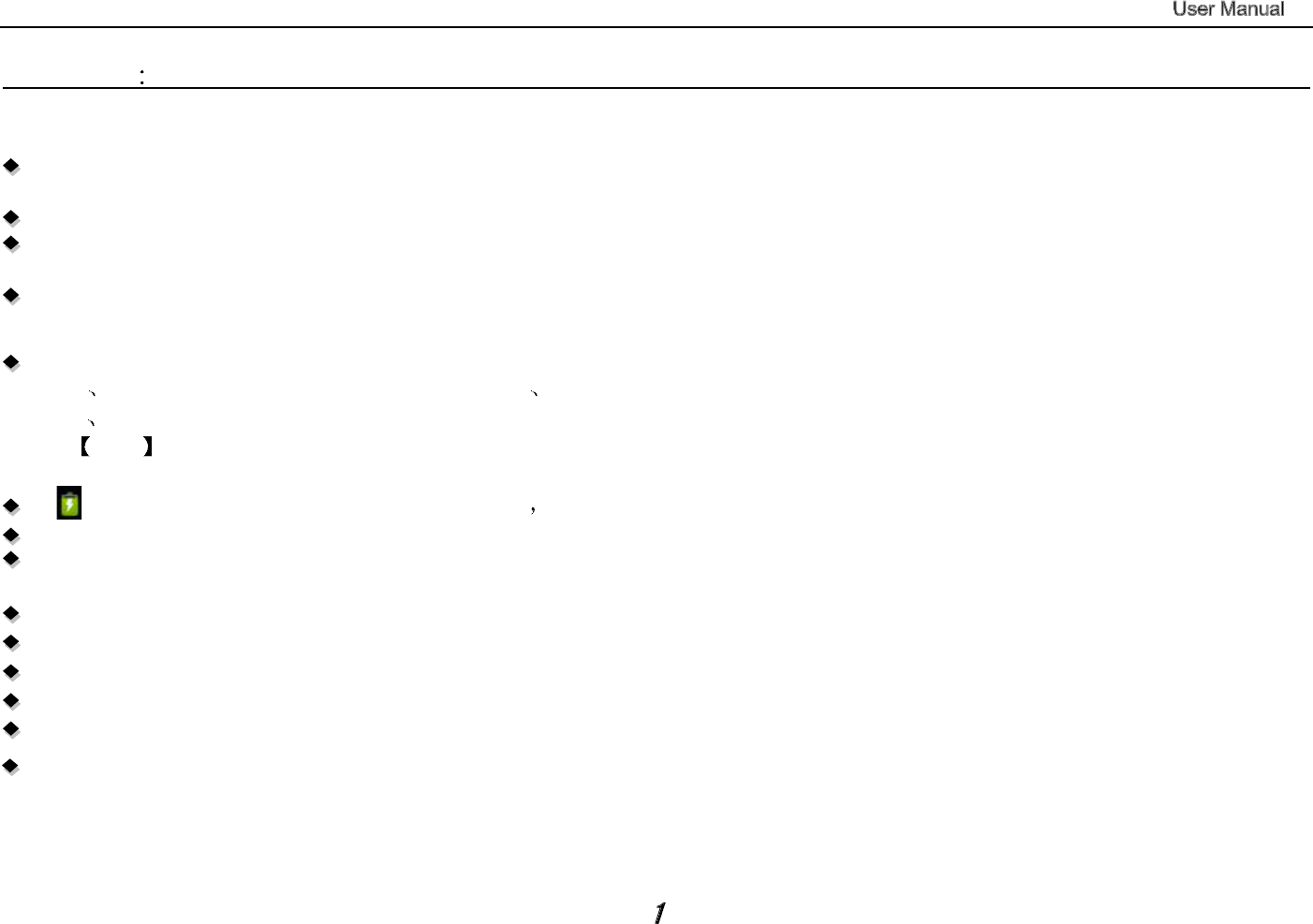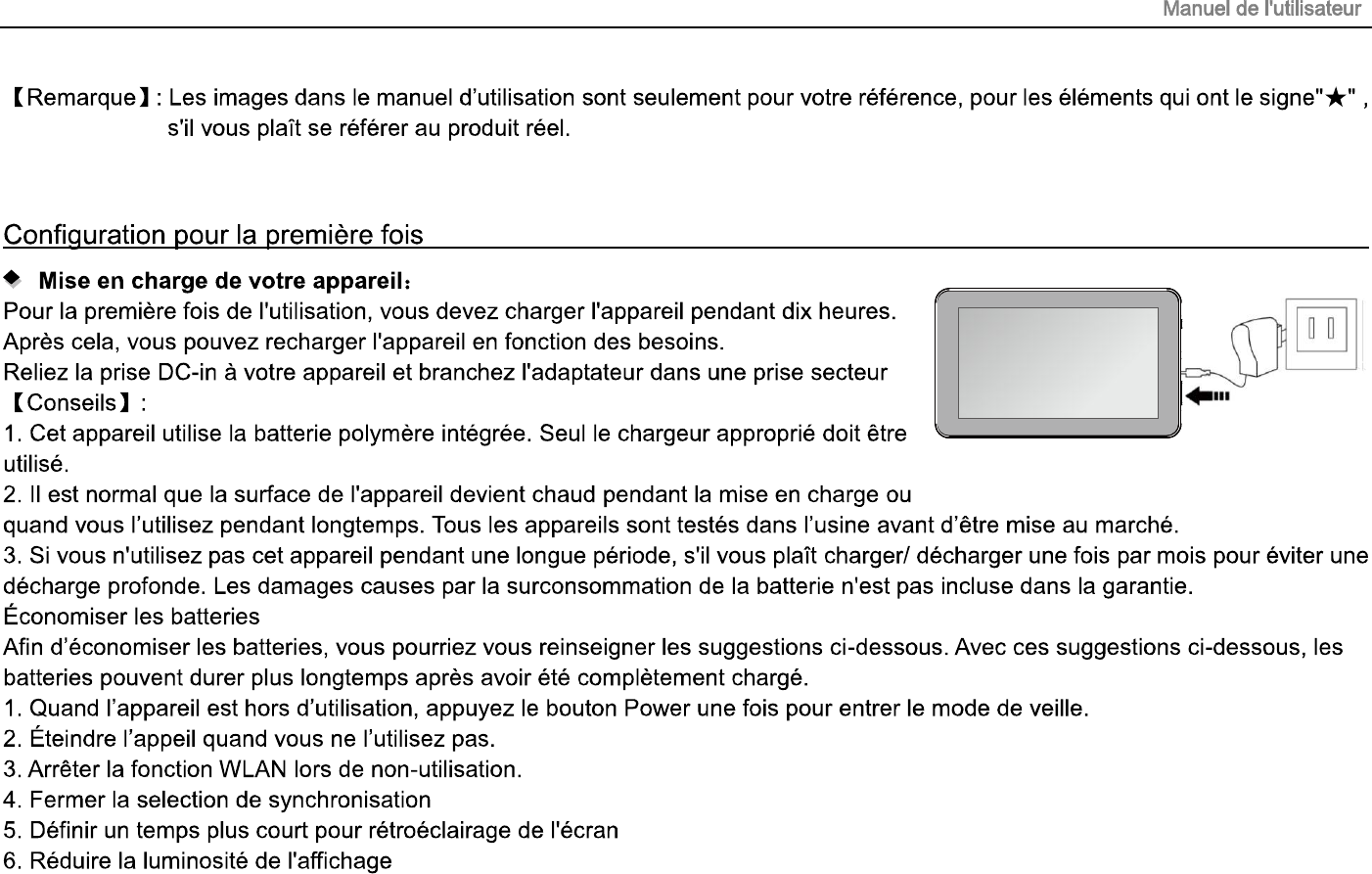 1. This device adopts built-in polymer battery. Only the specified charger should be used.