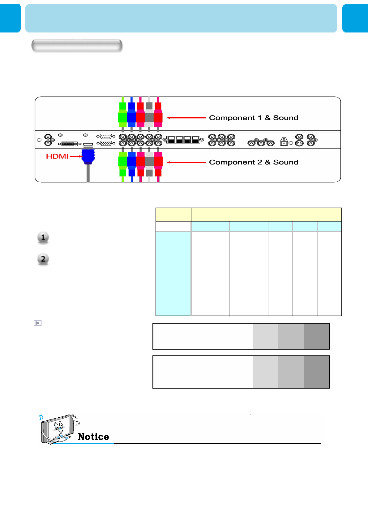 RCA X 2Port (Y, Pb/Cb, Pr/Cr : 480i, 480p, 576i, 576p, 720p, 1080i)Component1,2 Input