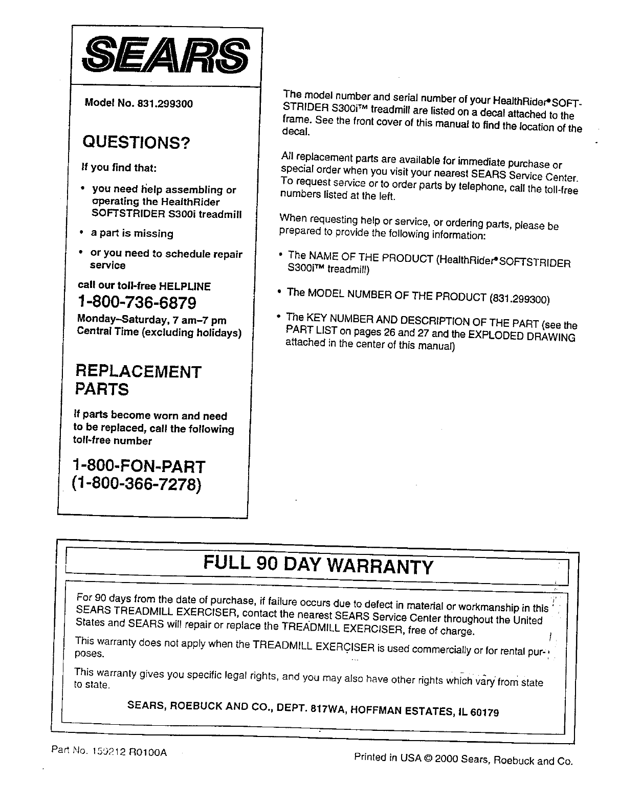 SEARS TREADMILL EXERCISER, contact the nearest SEARS Service Center throughout the United