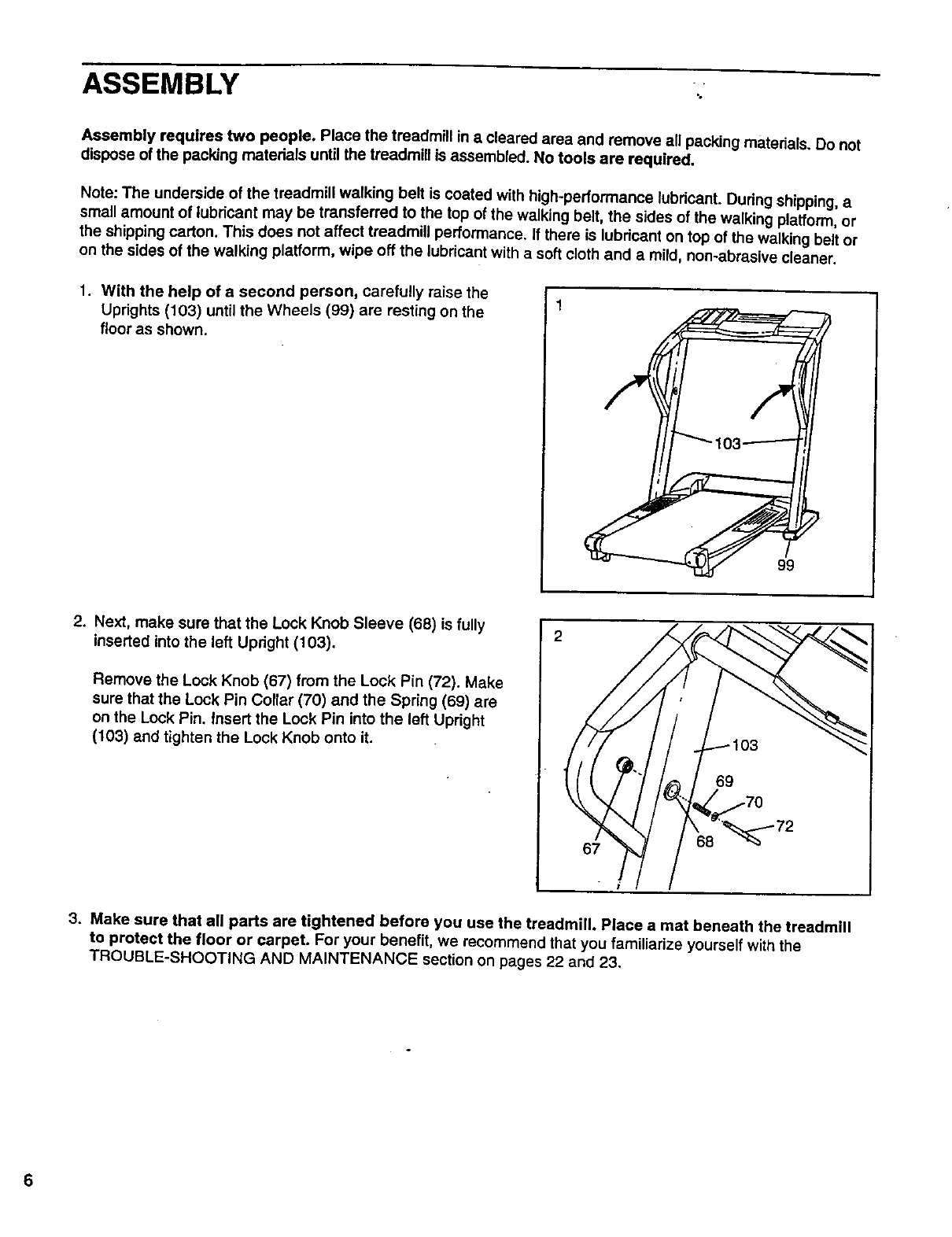 Assembly requires two people. Place the treadmill in acleared area and remove all packing materials. Do not
