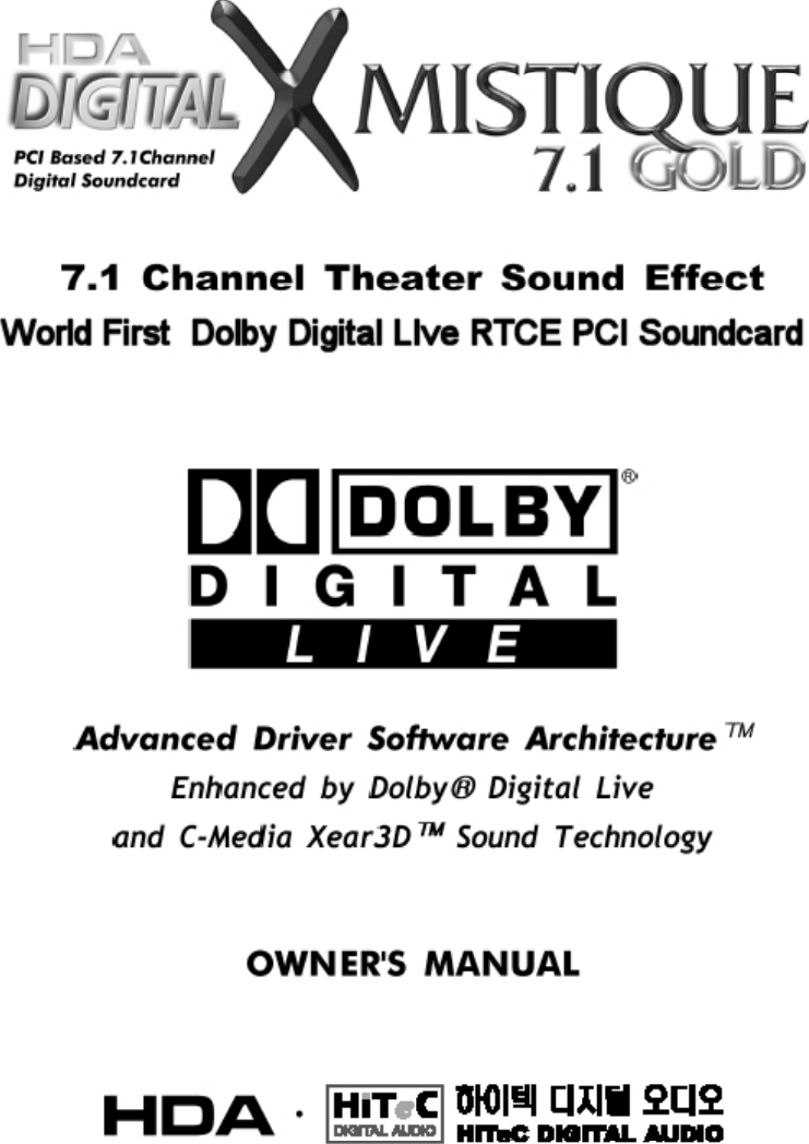 1. Introduction  Thanks for purchasing our HDA Digital X-Mystique 7.1 GOLD soundcard. This owner’s manual is a guide for users to understand how to use the new generation Advanced Driver Software Architecture (ADSATM) for C-Media CMI8768+ chipset powered by Dolby® Digital Live encoder (Dolby Digital Live Real-Time Content Encoder) and Xear 3DTM sound technology. With this manual, users can quickly take advantage of these great features to enjoy amazing sound effects even better than consumer acoustics.                      - Support EAX2.0TM or A3D1.0TM - Support DS3DTM H/W &S/W - Magic VoiceTM - Sensaura® CPL3D engine -  7.1 Virtual SPEAKER SHIFTER - 5.1 Xearphone -  2-Speaker Virtual Theater -  Earphone Plus Personal Theater- Environment Emulation - Environment Sizes - 10-Band Equalizer DVD Movies Gamess Music (MP3/CD) - Magic VoiceTM -  Microphone Echo Effect - Key-Shifting - Vocal Cancellation  Messenger/Karaoke/ VOIP Figure 1. ADSATM Features for All Applications