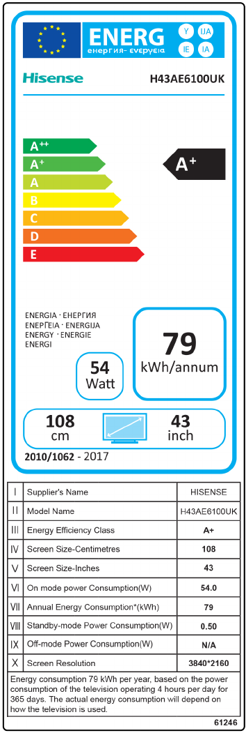 61246(BQ A182602 1) H43AE6100UK(HE43A6100UWTS(1001)) 英国 HISENSE 能效标签 无标注 H43AE6100UK Energy Label Product Fiche