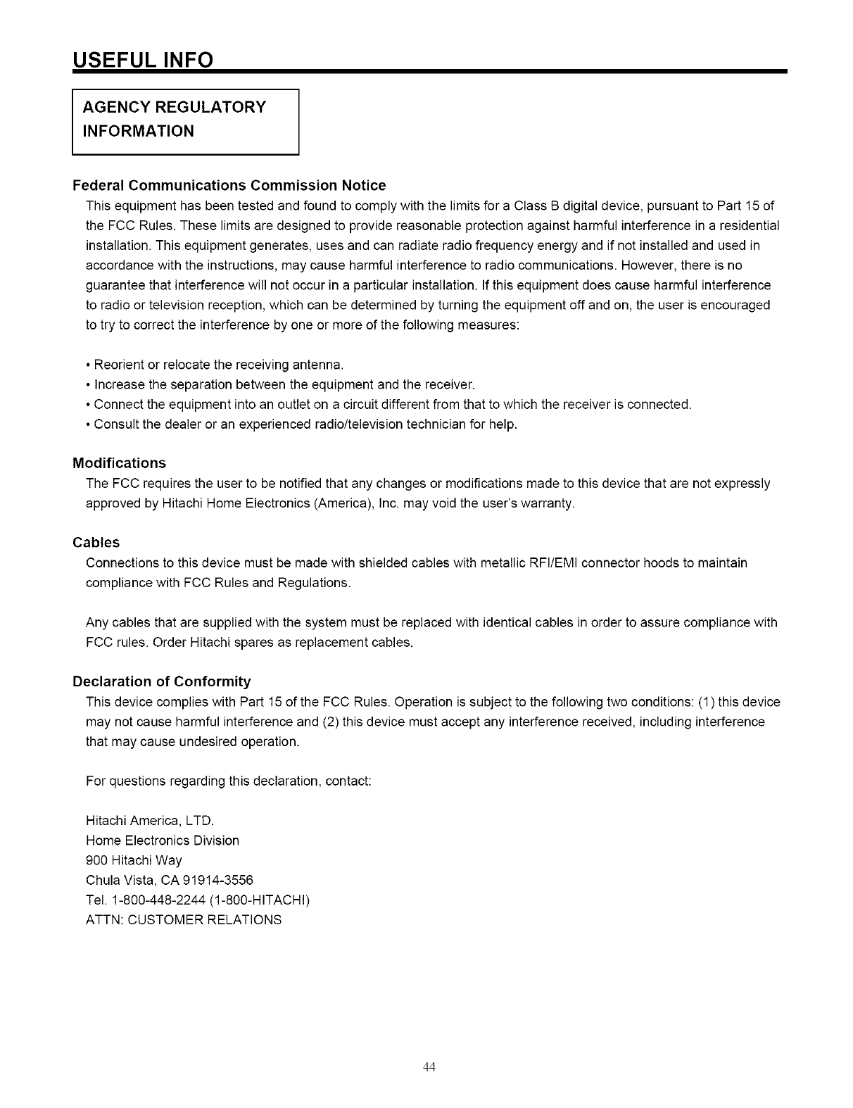 expressly approved by Hitachi America, Ltd. Home Electronics Division may void the user's authority to